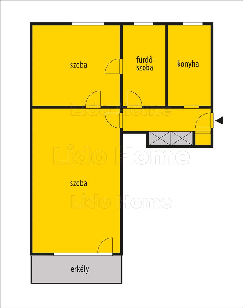 55 m2-es, 2. emeleti, 2 szoba, folyosó, fürdőszoba+WC, konyha, éléskamra elrendezésű, erkélyes lakás.
