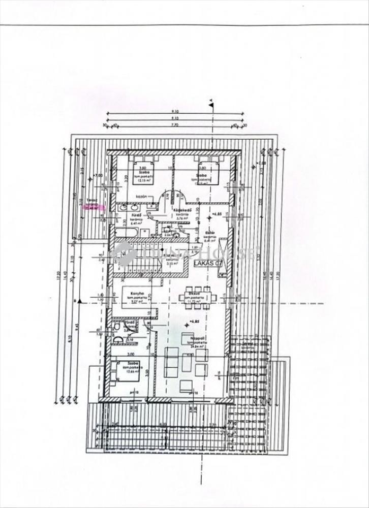 Az ingatlan az alábbi helyiségekből áll: nappali-ebédlő-konyha, 3 szoba 2 fürőszoba + wc, előszoba, közlekedő, hatalmas 110 m2-es terasz!