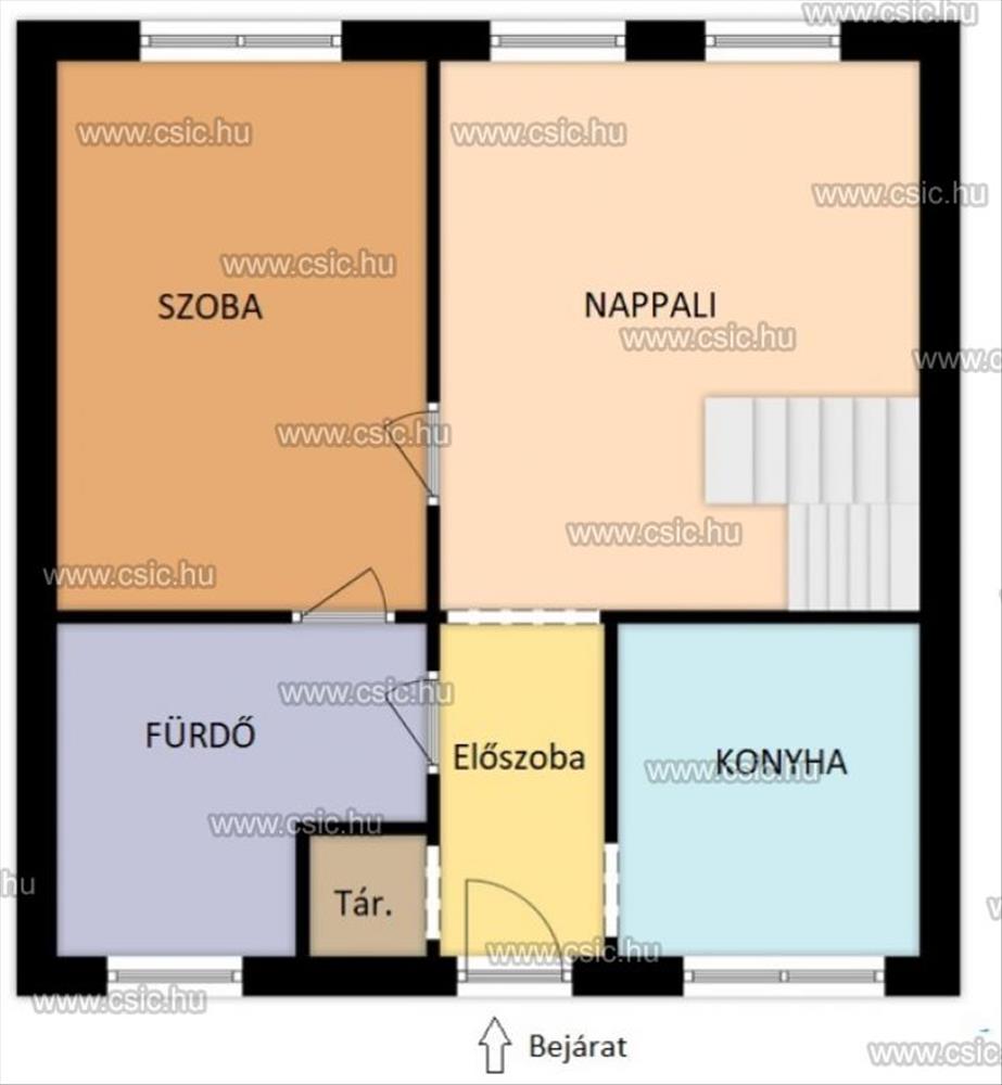 •az első szinten: konyha helyiség ( konyhabútort nem tartalmazza az ár), előszoba, kádas fürdő-mosdó, nappali; szoba