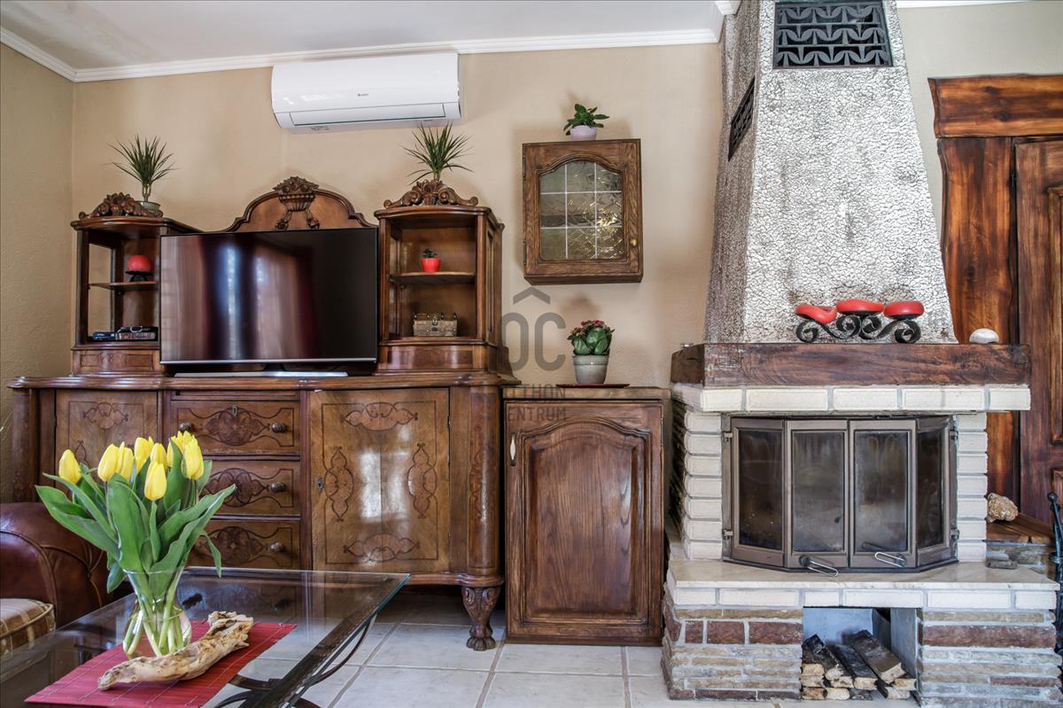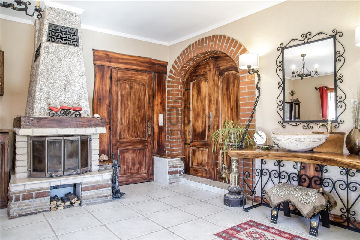 A ház rusztikus stílusban, természetes anyagokkal készült – kő, fa és kovácsoltvas határozza meg a karakterét, miközben a korszerű megoldások (napelem, önálló gépészet, külön mérőórák) biztosítják a modern kényelmet.
