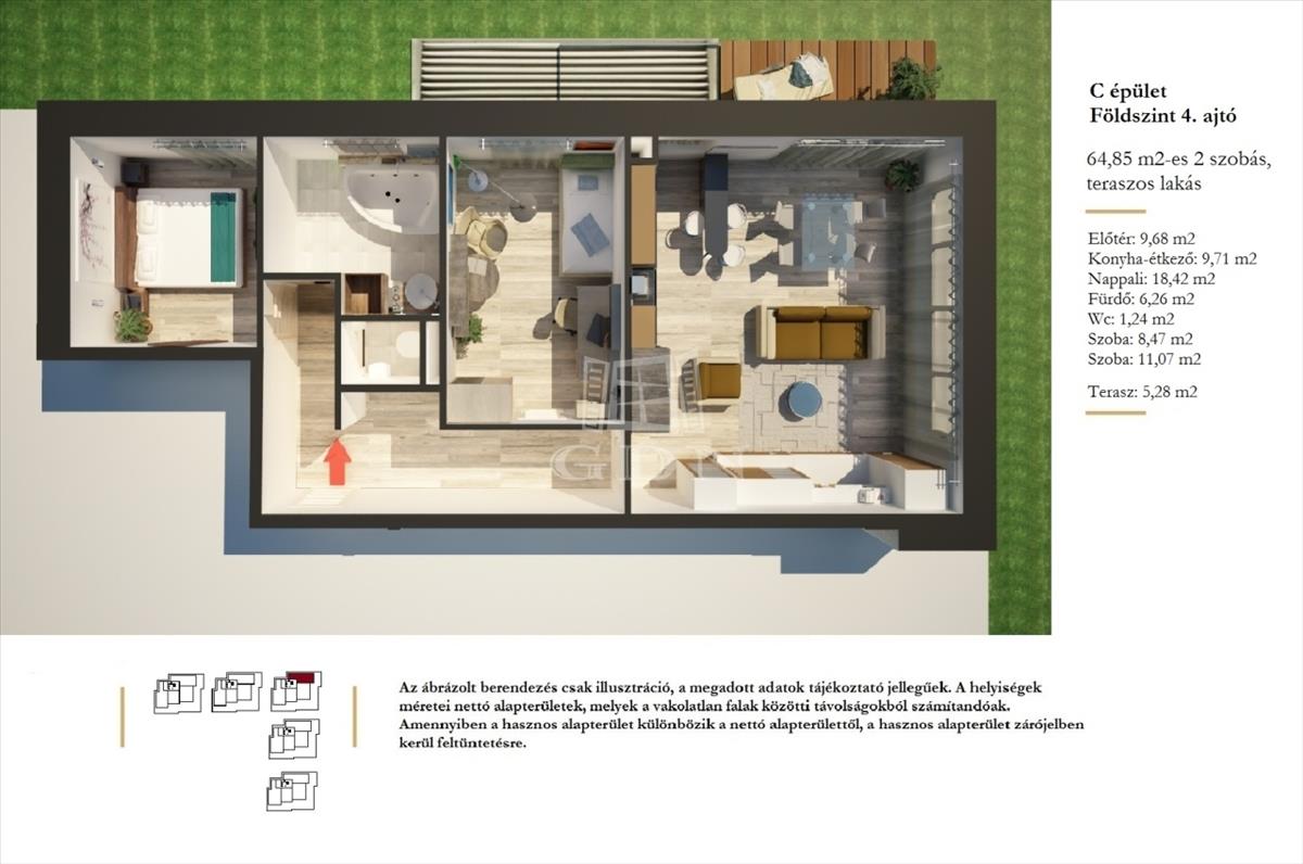 Szigetszentmiklós-Lakihegyen új építésű exkluzív lakóparkban, a II. Ütemben megvalósult “c” épületben kínálunk eladásra, egy földszinti kertkapcsolatos nettó hasznos 64, 85 m² lakóterületű nappali + 2 szobás új építésű lakást, 5, 28 m² terasszal.