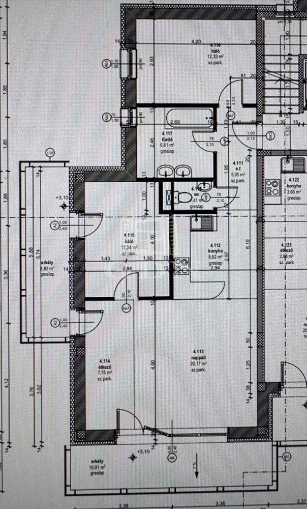 nappali-konyha-étkező 36, 84m2, szoba 12, 33m2, szoba 11, 34m2, fürdőszoba 6, 61m2, toalett 1, 41m2, előszoba 5, 05m2, erkély 10, 91m2, erkély 8, 82m2;