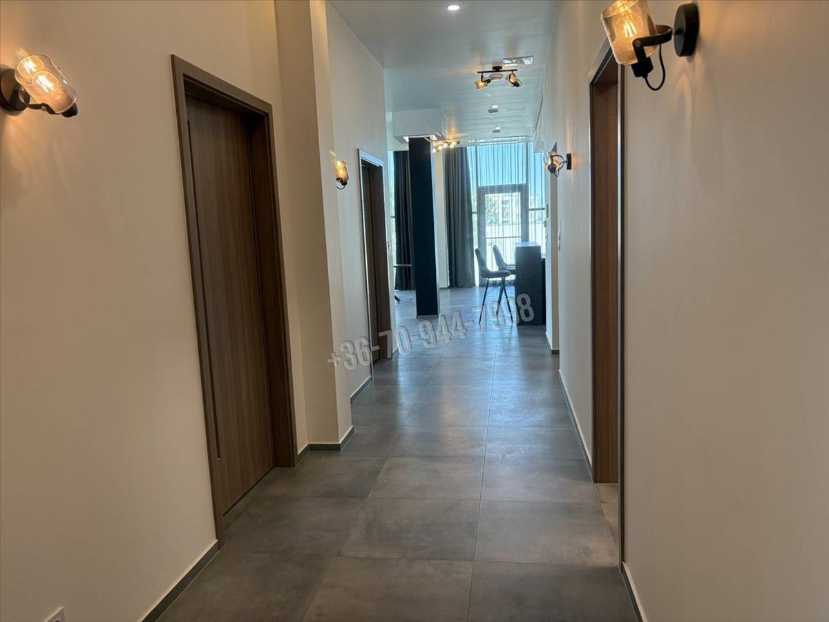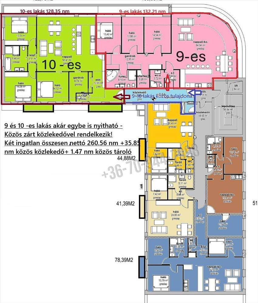 A lakáshoz tartozik egy 35, 85 m²-es, zárt, kizárólagos használatú közlekedő és előtér-rész, amely elegáns érkezést biztosít, és igény esetén lehetőséget ad arra is, hogy a szomszédos lakással könnyedén összekapcsolható legyen.