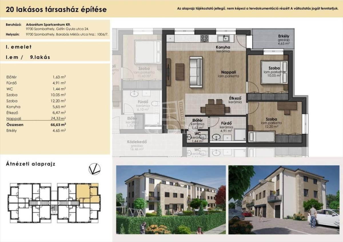 A három szintes kettő emeletes, 20 lakásos modern társasházak minden igényt kielégítő, magas műszaki tartalommal valósulnak meg. a kiváló tájolású 40-67 m2 közötti ingatlanokat nagyon jó elosztás és élhető terek jellemzik. a lakások nappali+egy, nappali +kettő szobásak lesznek. a földszinti lakások komfortérzetét teraszok, saját kertek az emeleti lakásokét jó méretű erkélyek fokozzák. Nyílászárói 3 rétegű fokozottan hő- és hangszigetelt üvegezésű műanyag ablakok és erkélyajtók, redőny fogadására alkalmas szemöldök kialakítással. a lakások bejárati ajtaja mabisz minősítéssel rendelkező tömör, több ponton záródó biztonsági ajtó. Fűtése központi gázfűtés tervezett, kondenzációs gázkazánnal a lakásokban egyedi hőmennyiség szabályozással és mérővel, padlófűtéses hőleadással. Klímaelőkészítést a vételár magában foglalja. Hideg -meleg burkolatok, szaniterek, csaptelepek, beltéri ajtók választhatók. Az ingatlanhoz felszíni parkoló, garázs vásárolható.
