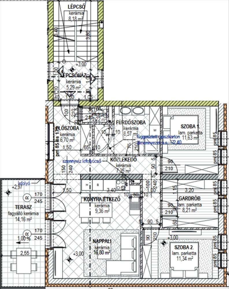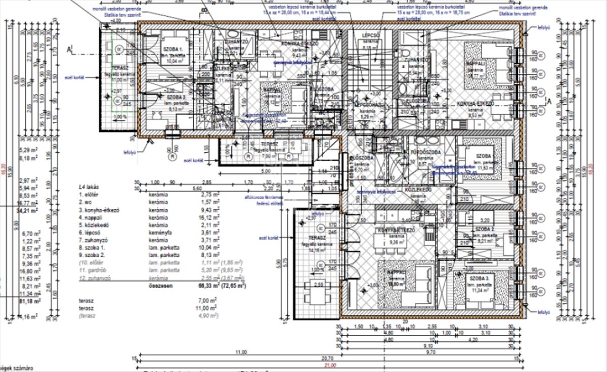 Költők utcája, poéta- HÁZSzombathely belvárosában, a " költők utcái " városrészen csendes, átmenő forgalomtól mentes utcában hat lakásos társasházban, prémium kategóriás lakások, közös kertkapcsolattal eladók. Az ingatlanban mindenki számára alkalmas lakások épülnek. Egy szobástól - négy szobásig, 34 m2 - 86 m2 között. Különlegessége, hogy az első emeleti egyik lakása belső kétszintes. Az ingatlan magas műszaki tartalommal készül. a lakásokat elválasztó falazat hanggátló téglából épül. Homlokzatára 15 cm vastag eps szigetelés kerül, dryvit vakolattal. Műanyag, fokozottan hang-és hőszigetelt nyílászárói kívül barna, belül fehér színű tokszerkezettel 3 rétegű üvegezéssel készül, redőnyökkel felszerelve. a tetőtérben Fakro ablakokra tervezett, hővédő árnyékolókkal. a fűtés, meleg vízellátás a mai kor követelményeinek leginkább megfelelő házközponti lg hőszivattyús fűtésrendszer kerül kialakításra, H tarifával, minden helyiségben padlófűtéses hőleadással. Napi és heti programozású digitális termosztátokkal. a fürdőszobákban a padlófűtés mellett, törölköző szárítós radiátorok lesznek kialakítva. a lakások nappalijában hűtő-fűtő klíma kerül. Villanyhálózata 3 x 16 Amper teljesítményű. Választható hideg-meleg burkolatok, szaniterek, csaptelepek, beltéri ajtók. Zárt, parkosított udvarában felszíni parkolók, fedett gépkocsibeállók vásárolhatók. Az ingatlan klasszikus, igényes külső megjelenése belvároshoz méltó. a hirdetésben szereplő lakás L3-as, 81. 18 m2, +14. 16 m2 terasz. Első emeleti, 4 szobás lakás, kertre néző terasszal.
