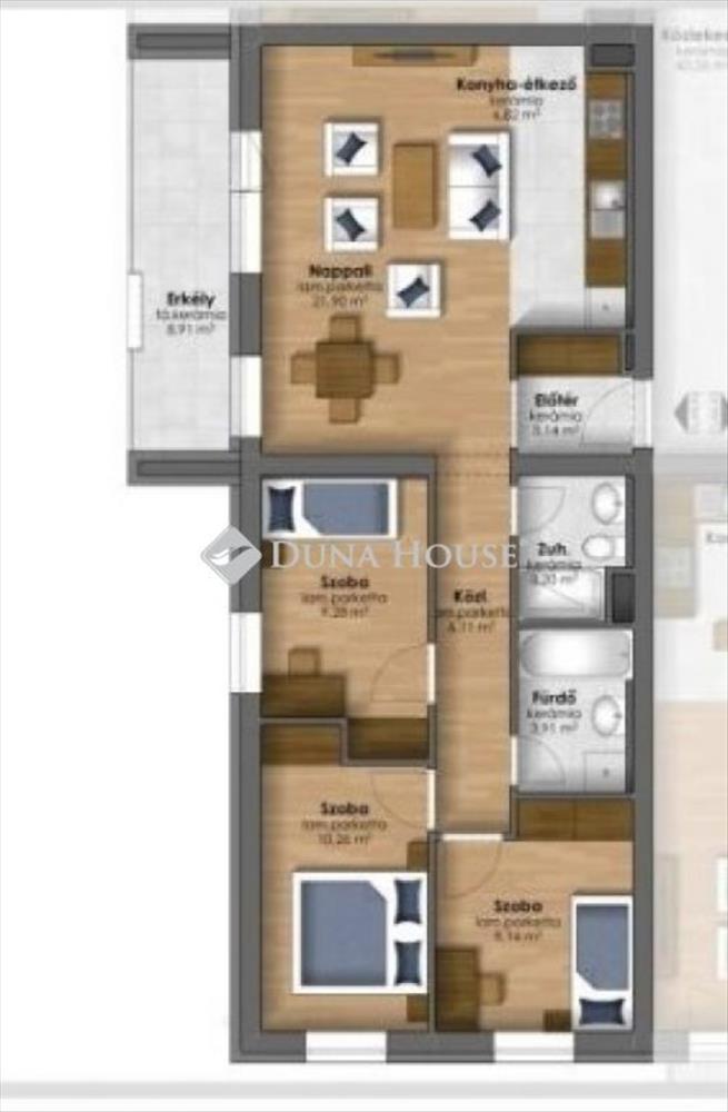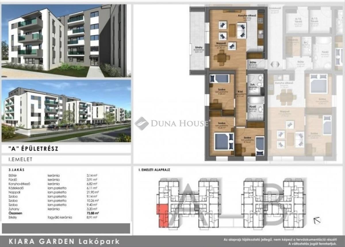 A hirdetésben szereplő lakás első emeleti, nappali + 3 szobás, alapterülete 73, 88 nm + 8, 73 nm erkély tartozik hozzá.