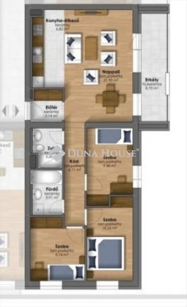A hirdetésben szereplő lakás harmadik emeleti, nappali + 3 szobás, alapterülete 73, 87 nm + 8, 73 nm terasz tartozik hozzá.