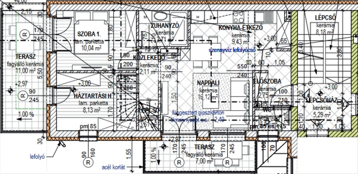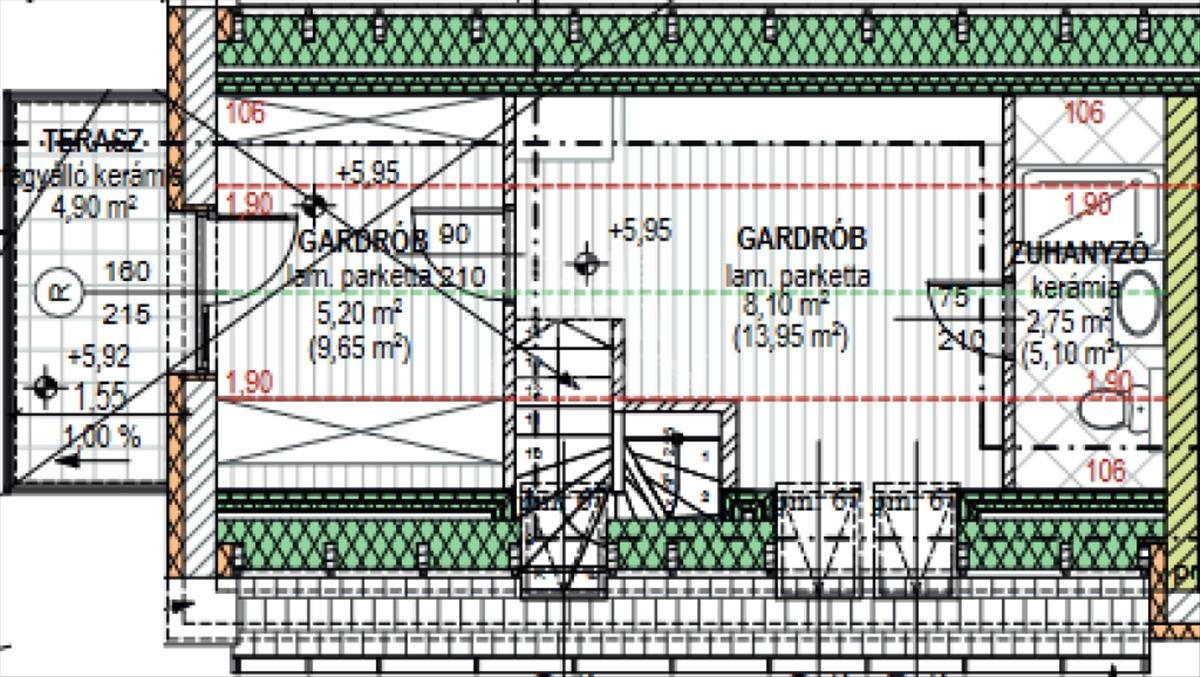 (nettó 73. 52 m2) + 11 m2, 7 m2, 5, 92 m2 teraszokkal első emeleti belső kétszintes. Amerikai konyhás nappali, 3 hálószoba, előszoba, közlekedő, gardrób, 2 fürdőszoba, külön wc került kialakításra.