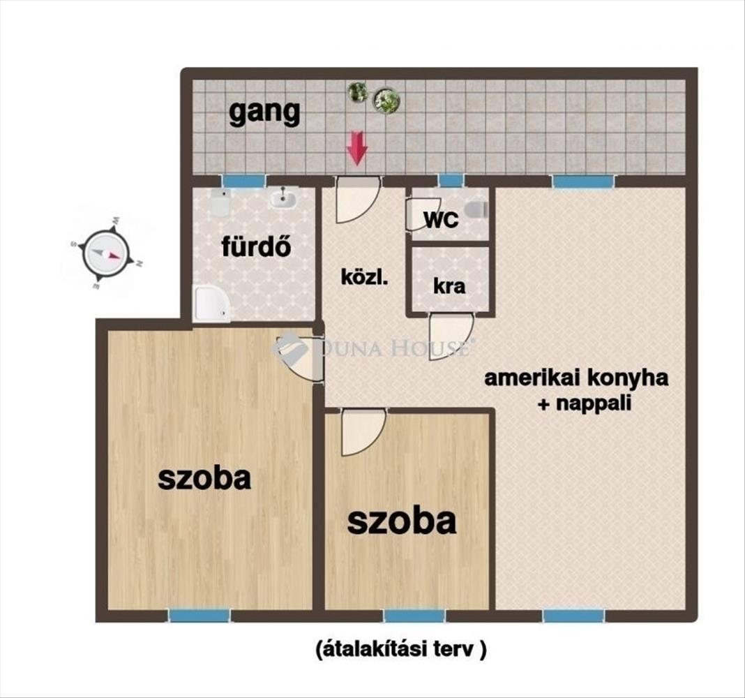(Ötlet: nagyszoba lefelezve, konyhával összenyitva nappali, két szoba kialakítható, tervrajz mellékelve)