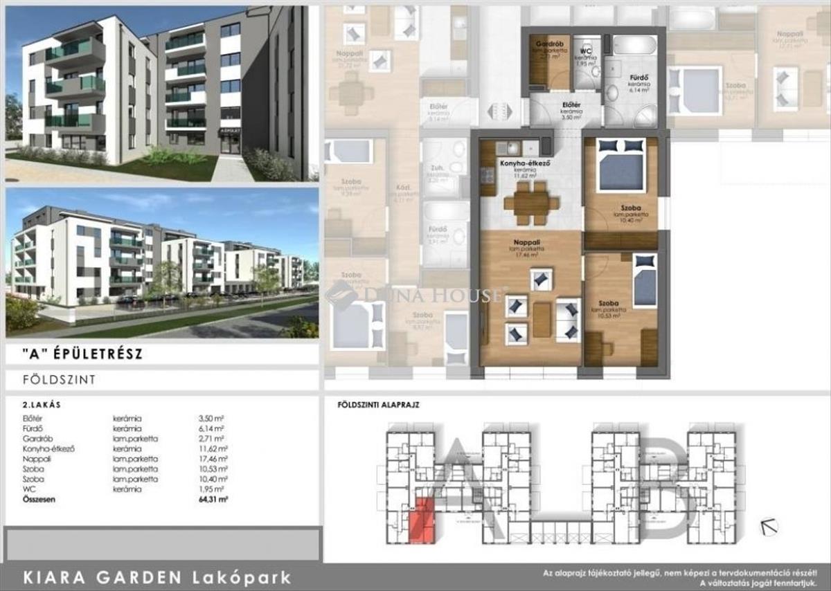 A hirdetésben szereplő lakás földszinti, nappali + 2 szobás, alapterülete 64, 31 nm.