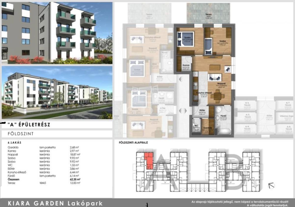 Szombathely zöldövezeti, dinamikusan fejlődő városrészén, energiahatékony, modern lakások várják új tulajdonosaikat. Kiara Garden lakóparkban kettő ütemben épülő, minden igényt kielégítő lakásai nappali+1 szobával, nappali+2 szobával, nappali+ 3 szobával fognak rendelkezni. Az ingatlanokhoz nagy erkélyek teraszok is tartoznak. a legnagyobb lakás dupla komfortos kialakítású lesz. Egyedülállóktól a nagy családosokig megfelelő otthona lehet bárkinek. a belváros közeli ingatlanok lehetőséget biztosítanak egyedi belső kialakításokra. a lakás gazdaságos fűtéséről és melegvíz ellátásáról távhő szolgáltató gondoskodik. a fűtésrendszer egyedileg szabályozható, saját hőmennyiség mérővel ellátott. a hőleadás padlófűtésen keresztül történik. Az ingatlanok ideális hőmérsékletét, a nappaliban elhelyezett split klíma biztosítja. Az épületben kellő számú zárható tároló kerül kialakításra, külön bejárattal. ( 2. 96 m2-es tároló 1 790 000 Ft ) Természetesen vannak nagyobb tárolók is. a lakótömbök udvarán található felszíni parkolók ára 1 490 000 Ft. Bővebb tájékoztatásért kérem vegye fel velem a kapcsolatot.