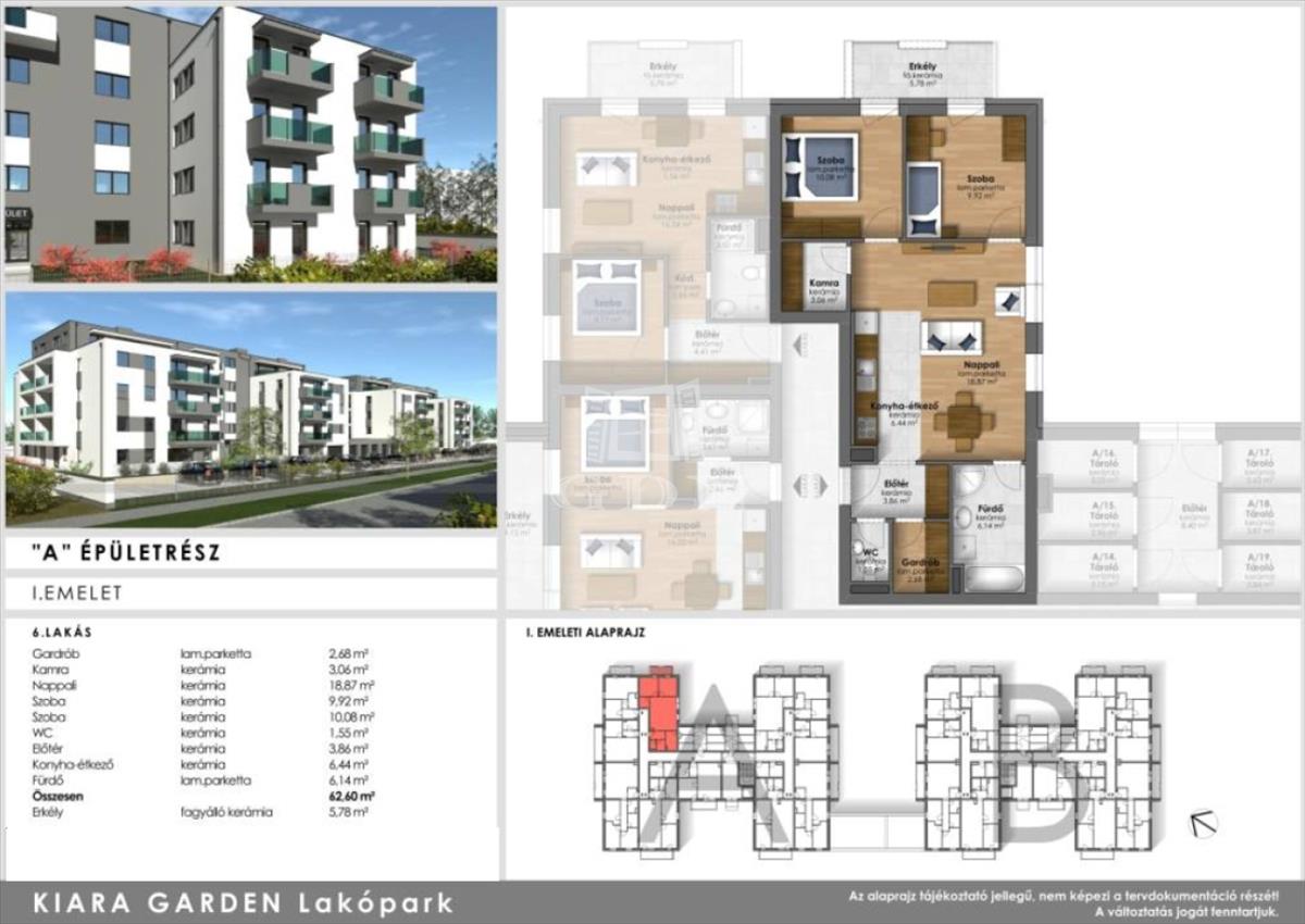 Szombathely zöldövezeti, dinamikusan fejlődő városrészén, energiahatékony, modern lakások várják új tulajdonosaikat. Kiara Garden lakóparkban kettő ütemben épülő, minden igényt kielégítő lakásai nappali+1 szobával, nappali+2 szobával, nappali+ 3 szobával fognak rendelkezni. Az ingatlanokhoz nagy erkélyek teraszok is tartoznak. a legnagyobb lakás dupla komfortos kialakítású lesz. Egyedülállóktól a nagy családosokig megfelelő otthona lehet bárkinek. a belváros közeli ingatlanok lehetőséget biztosítanak egyedi belső kialakításokra. a lakás gazdaságos fűtéséről és melegvíz ellátásáról távhő szolgáltató gondoskodik. a fűtésrendszer egyedileg szabályozható, saját hőmennyiség mérővel ellátott. a hőleadás padlófűtésen keresztül történik. Az ingatlanok ideális hőmérsékletét, a nappaliban elhelyezett split klíma biztosítja. Az épületben kellő számú zárható tároló kerül kialakításra, külön bejárattal. ( 2. 96 m2-es tároló 1 790 000 Ft ) Természetesen vannak nagyobb tárolók is. a lakótömbök udvarán található felszíni parkolók ára 1 490 000 Ft. Bővebb tájékoztatásért kérem vegye fel velem a kapcsolatot. FIX 3% lakáshitelre megvehető