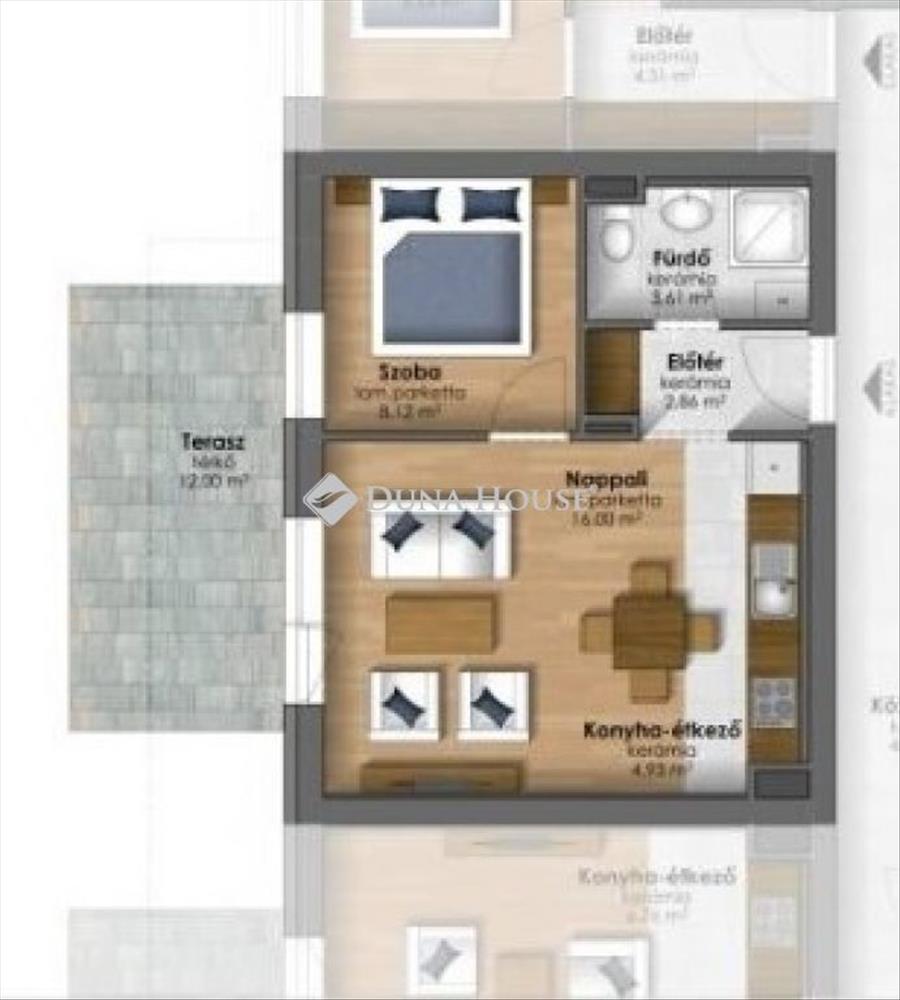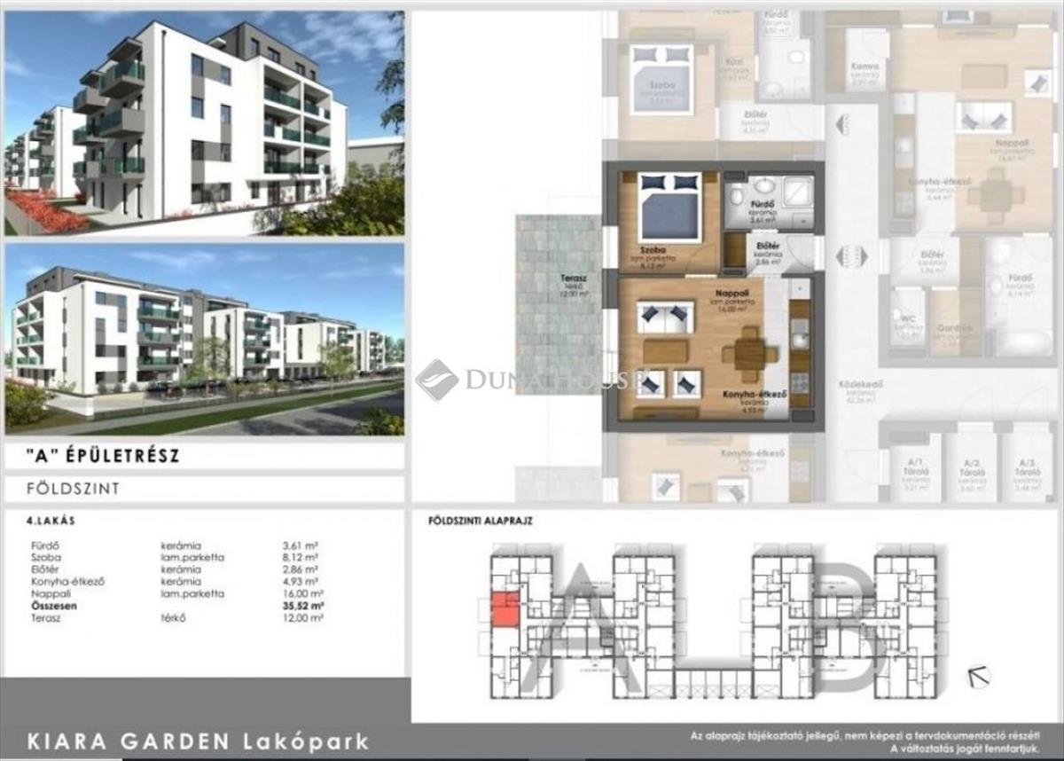 A hirdetésben szereplő lakás földszinti, nappali + 1 szobás, alapterülete 35, 52 nm + 12 nm terasz tartozik hozzá.