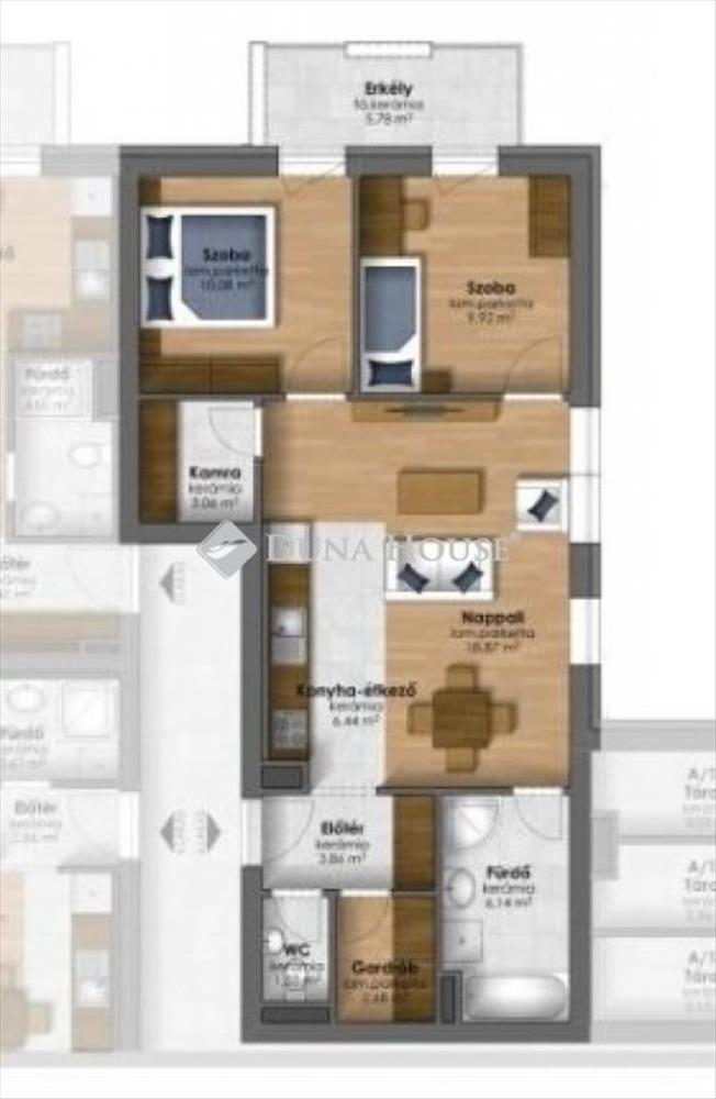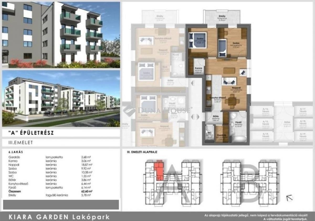 A hirdetésben szereplő lakás harmadik emeleti, nappali + 2 szobás, alapterülete 62, 6 nm + 5, 78 nm terasz tartozik hozzá.