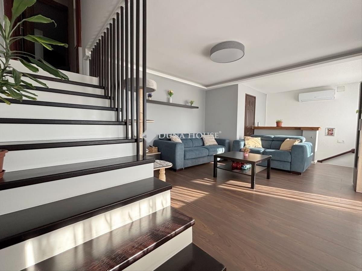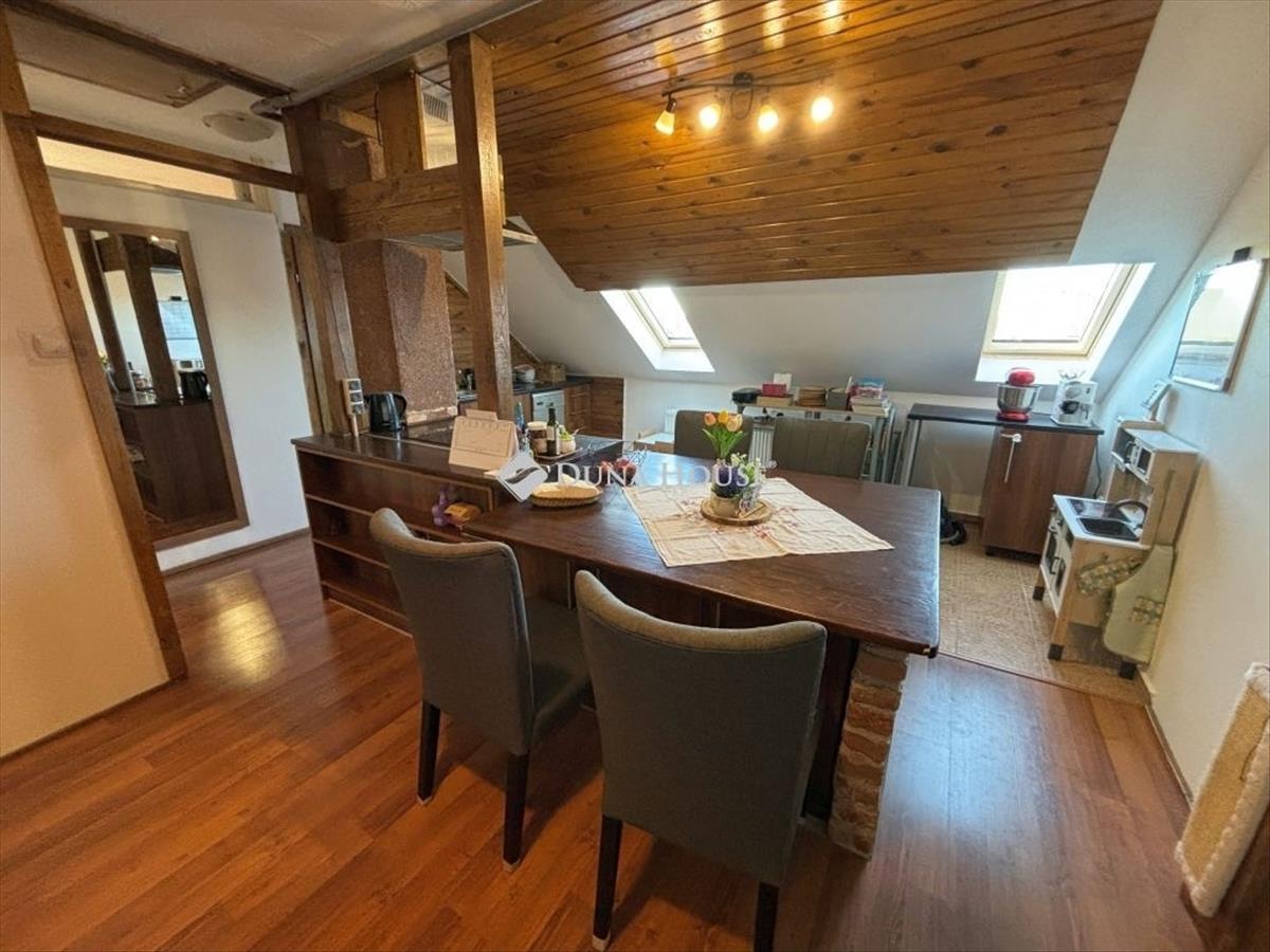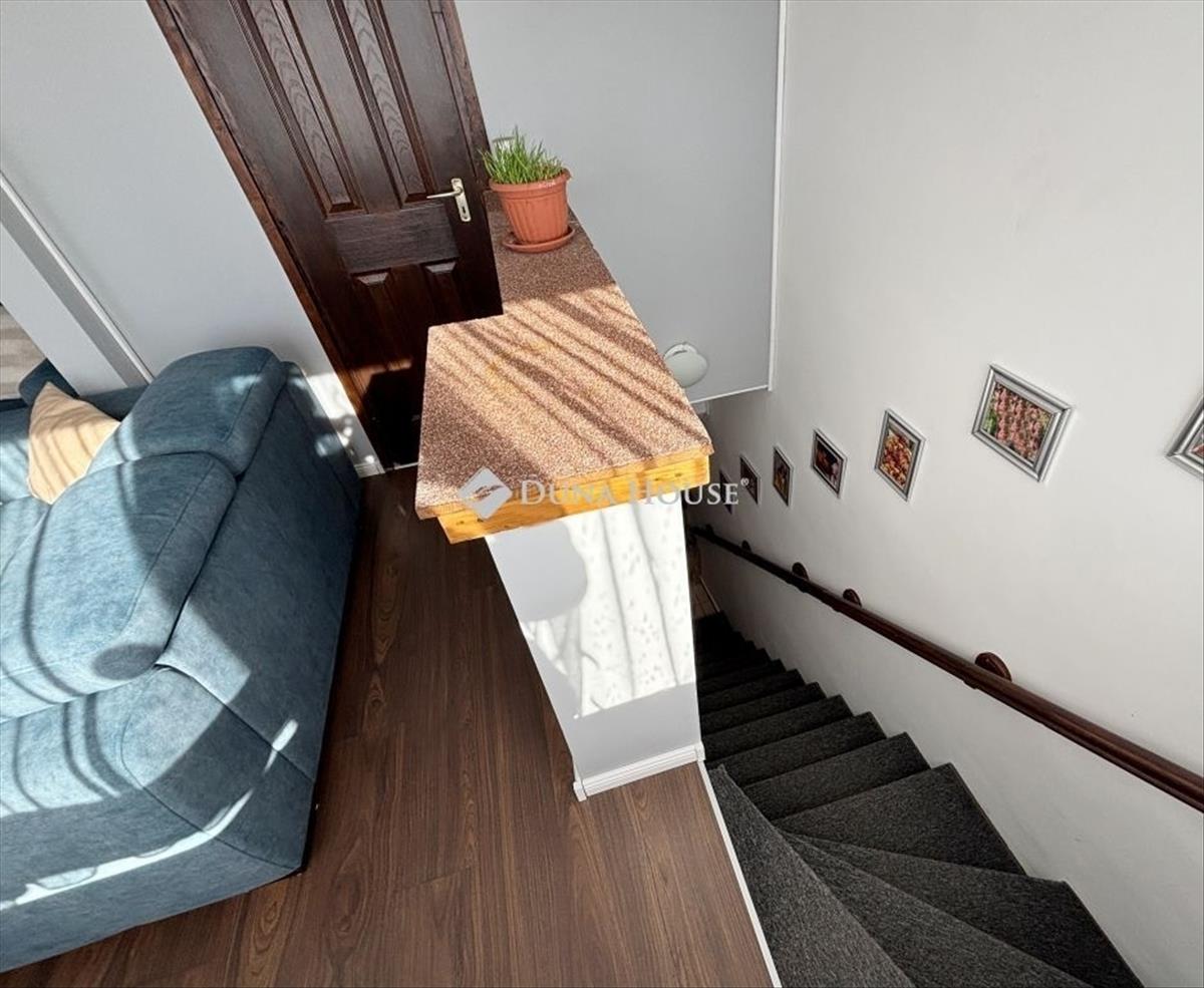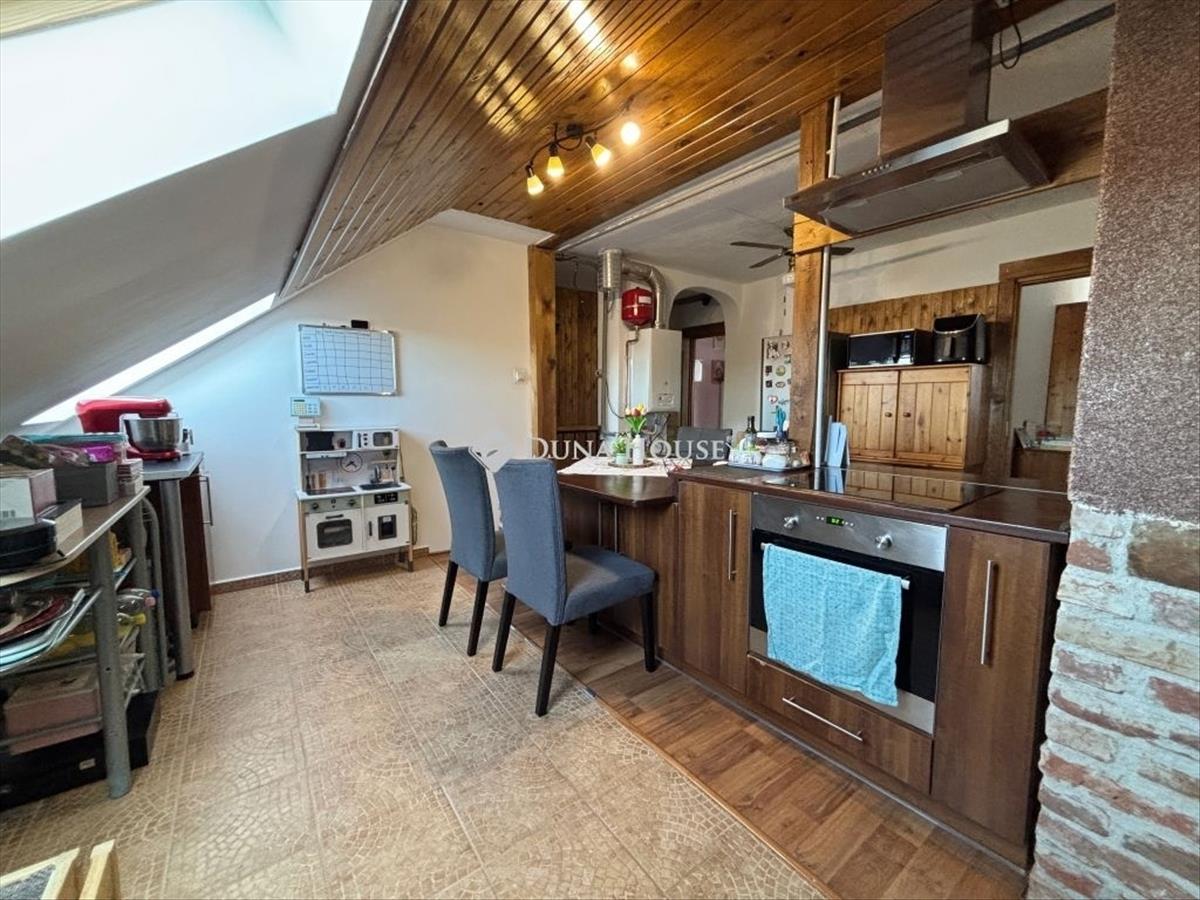 Szombathely kámon városrészén jó állapotú, nettó 90 m2 alapterületű lakás eladó. Az ingatlan egy kétlakásos társasház utcafronti oldalára nyílik, ahol egy kis udvarrész is tartozik hozzá. a térkövezett udvaron parkolni is lehet egy autóval, további egy gépkocsival a kapu előtti hídon. a lakás nagyobb része két szintre osztott, az emeleten egy tágas világos nappali fedett terasszal és egy mellékhelyiség van kialakítva, a tetőtérben kapott helyet a két hálószoba, a konyha étkezővel, egy fürdő és egy kis háztartási helyiség wc-el. a földszinti bejárati részen van még egy kis tároló és az előszoba. Az ingatlan rendezett karbantartott állapotú, az elmúlt években megújult többek között a nappali, és a nyílászárók is korszerűsítve lettek, az ablakok redőnnyel és rovarhálóval is fel vannak szerelve. a tetőtéri ablakokat tavaly cserélték korszerűbbre.