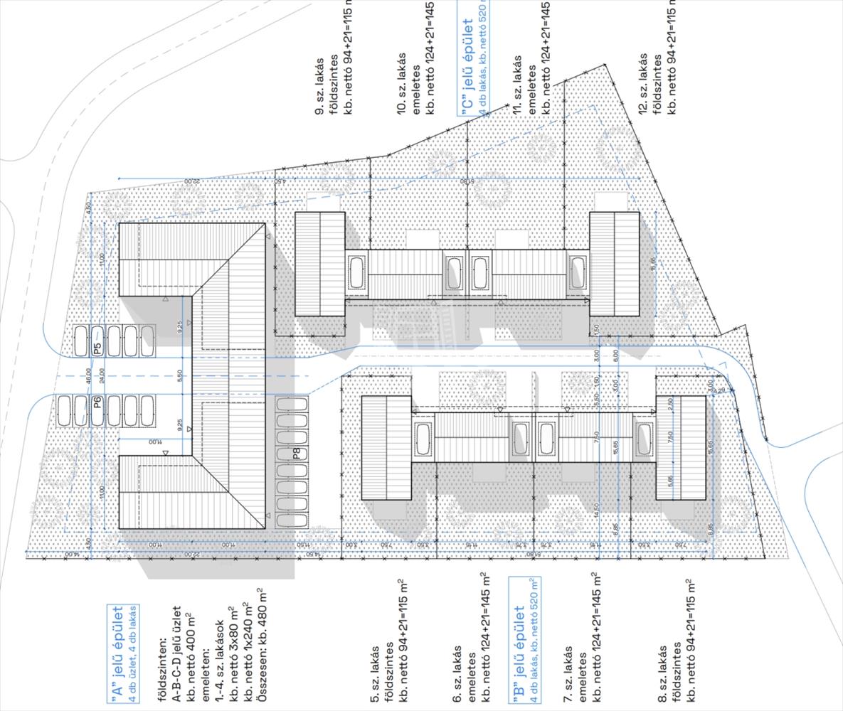 - 4 db földszinti lakás garázzsal + terasszal + saját kertrésszel.