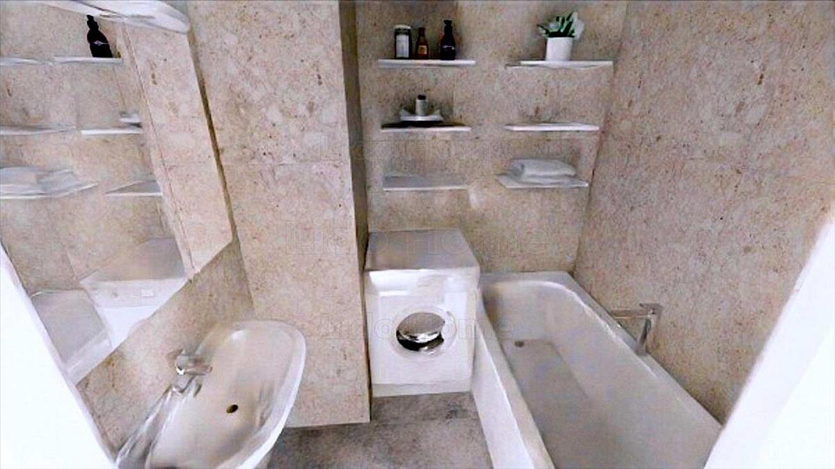 -Vizes blokkban kád és szaniterek, csaptelepek, falba épített tartály.