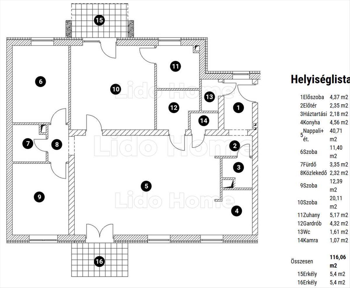 -Helyiségei: előszoba, előtér, konyha, kamra, háztartási helyiség, nappali + étkező, 3 szoba, közlekedő, gardrób, fürdő, zuhanyzó, wc.