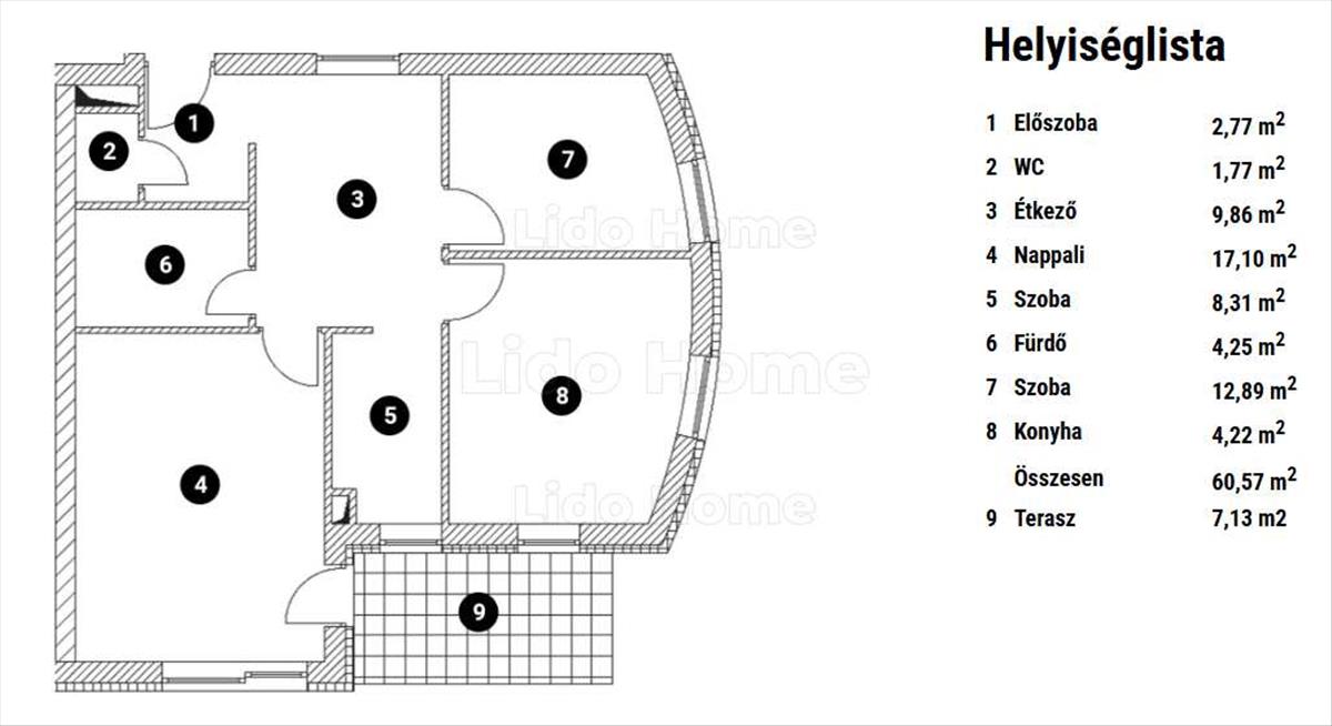 -Helyiségei: előszoba, konyha, nappali, étkező, 2 szoba, fürdő, wc.