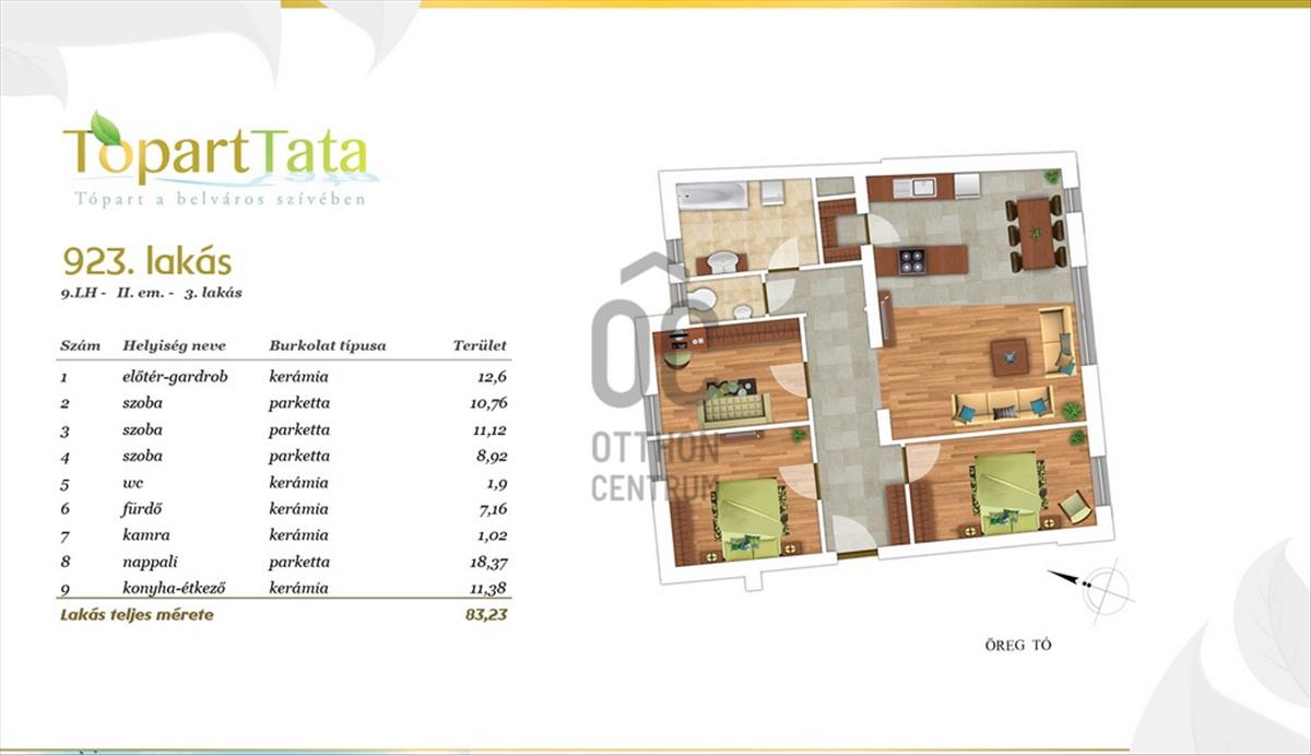 Gyedi fekvés, Egyedi ajánlat!Tatán az Öreg-tó partján 2016-ban épült 45 lakásos, zárt lakóparkban második emeleti, kertre néző, 83nm-es, 4 szobás, teljeskörűen berendezett, önálló fűtési rendszerrel ellátott otthon eladó. a lakást a magas minőség, elegancia, praktikus elrendezés és az élhető terek jellemzik.