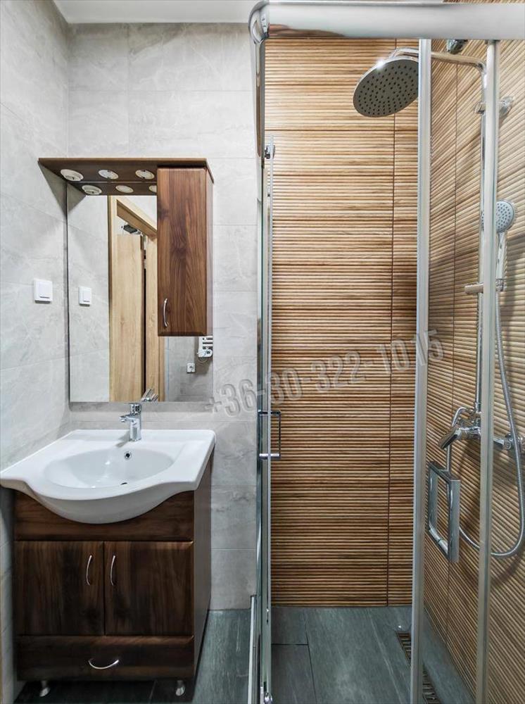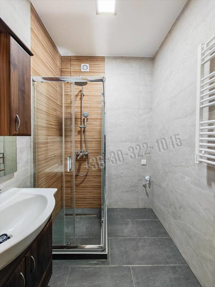 A fürdőszoba és a wc külön helyiségben található, mindkettő járólappal és csempével borított, modern megjelenést és praktikus elrendezést biztosítva.