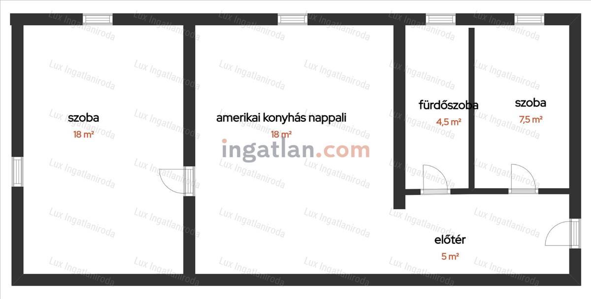 Amerikai konyhás nappali, két külön nyíló szoba, fürdő WC-vel és egy előszoba.