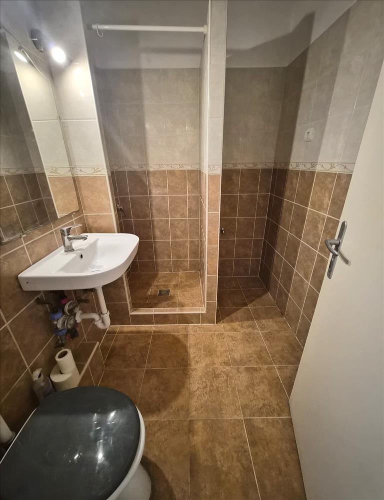 A fürdőszoba és a mellékhelyiség egy légtérben kapott helyet, ahol zuhanyzós kialakítás biztosítja a mindennapi kényelmet.