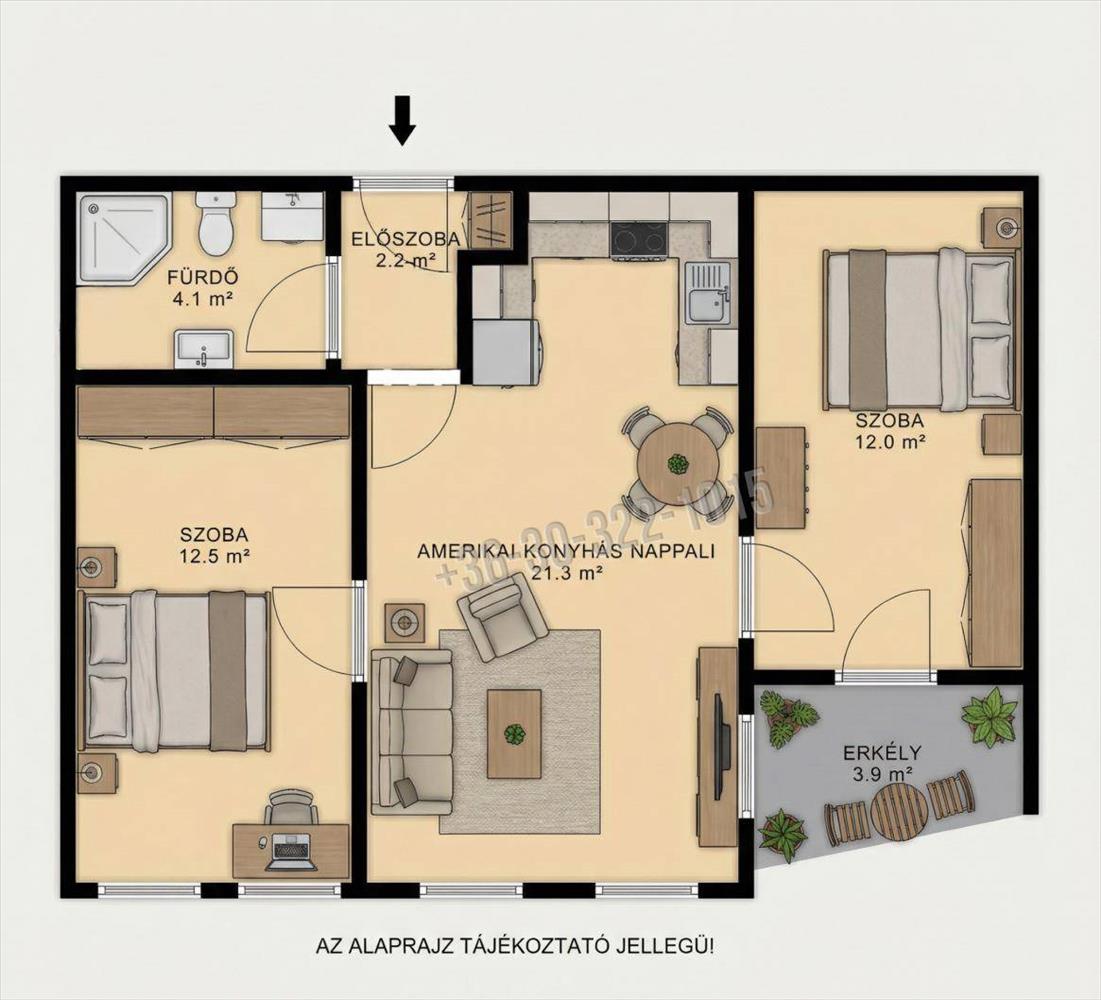 • Extrák: Beépített konyhai gépek (sütő, főzőlap), biztonsági bejárati ajtó és egy nagyméretű erkély, ahol élvezheti a reggeli kávéját.