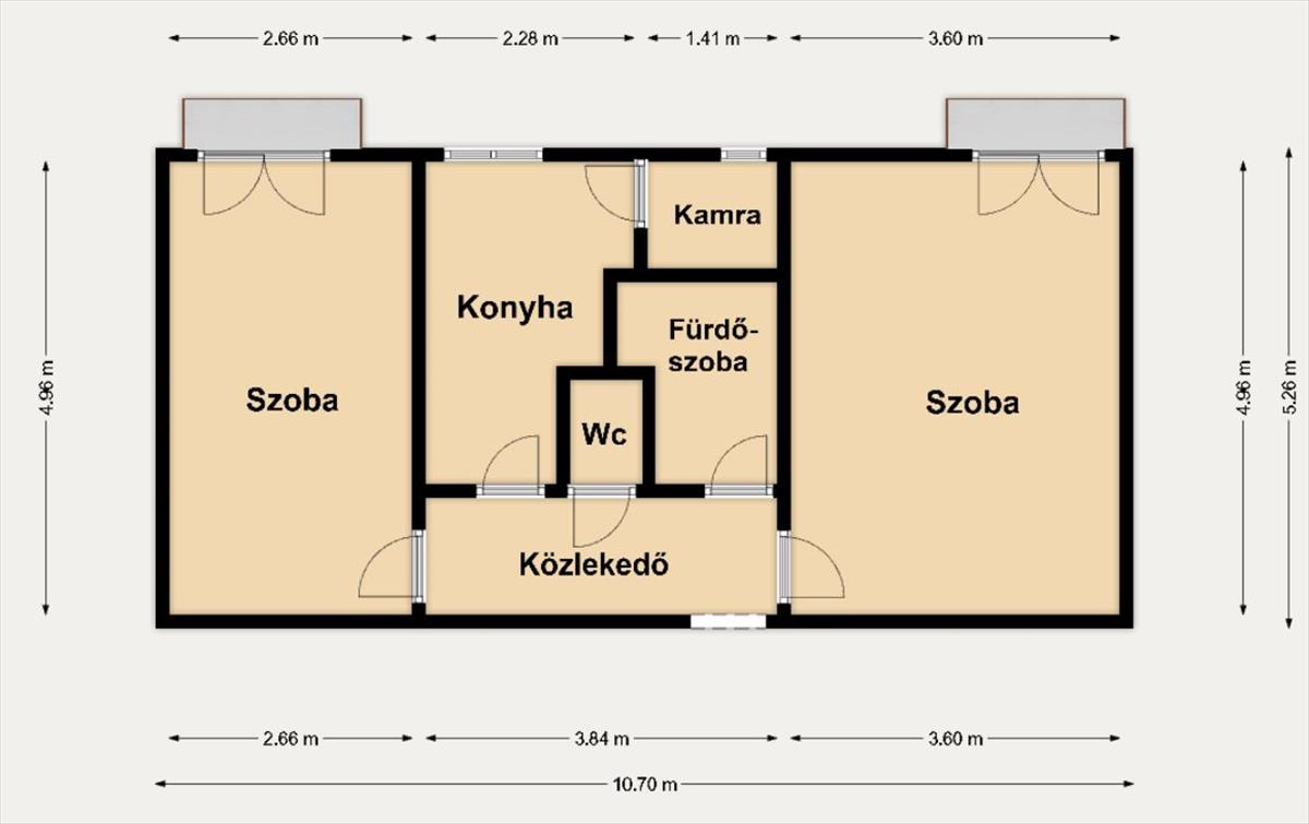 A belső elrendezés rendkívül élhető és átgondolt. Két külön bejáratú, világos és tágas szoba áll rendelkezésre, melyek közül a nagyobb 18 nm , míg a kisebb 13, 5 nm alapterületű.