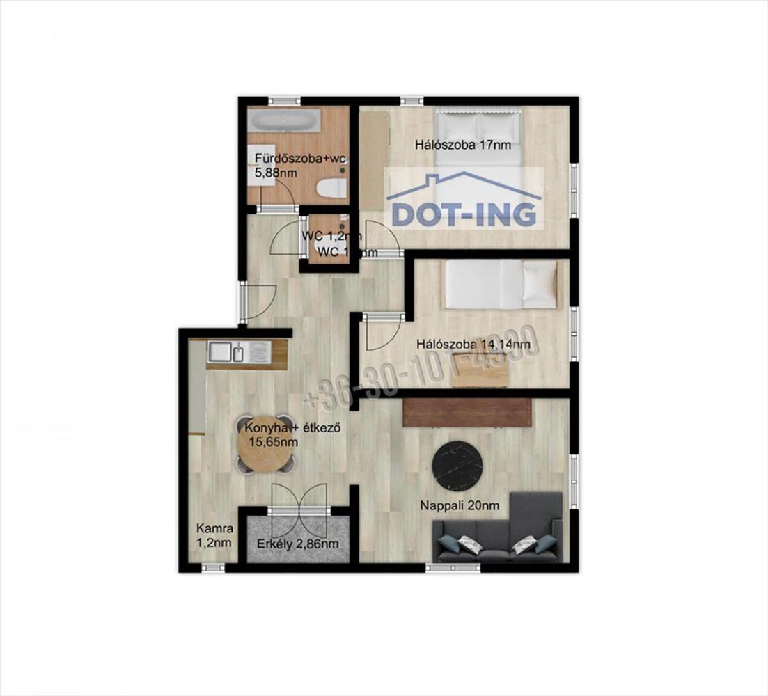 Egy impozáns amerikai konyhás nappali erkéllyel, 2 tágas, teljes értékű hálószoba, egy kádas fürdőszoba toalettel, plusz egy különálló mellékhelyiség került kialakításra.