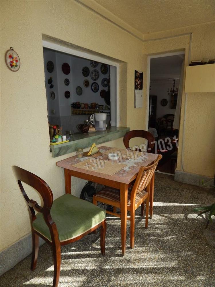 A fedett terasz (loggia) étkezőként is funkcionál, a konyhából széles átadóablakon keresztül tálalható.