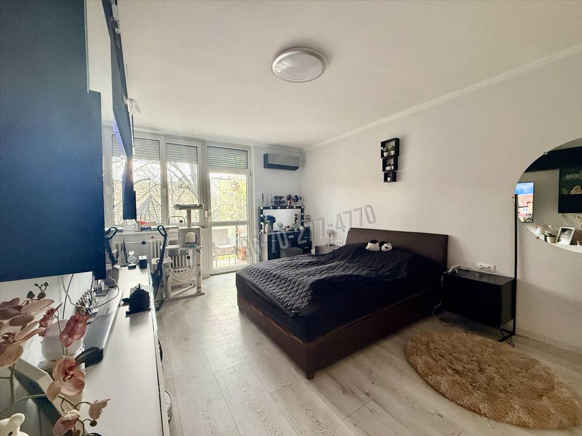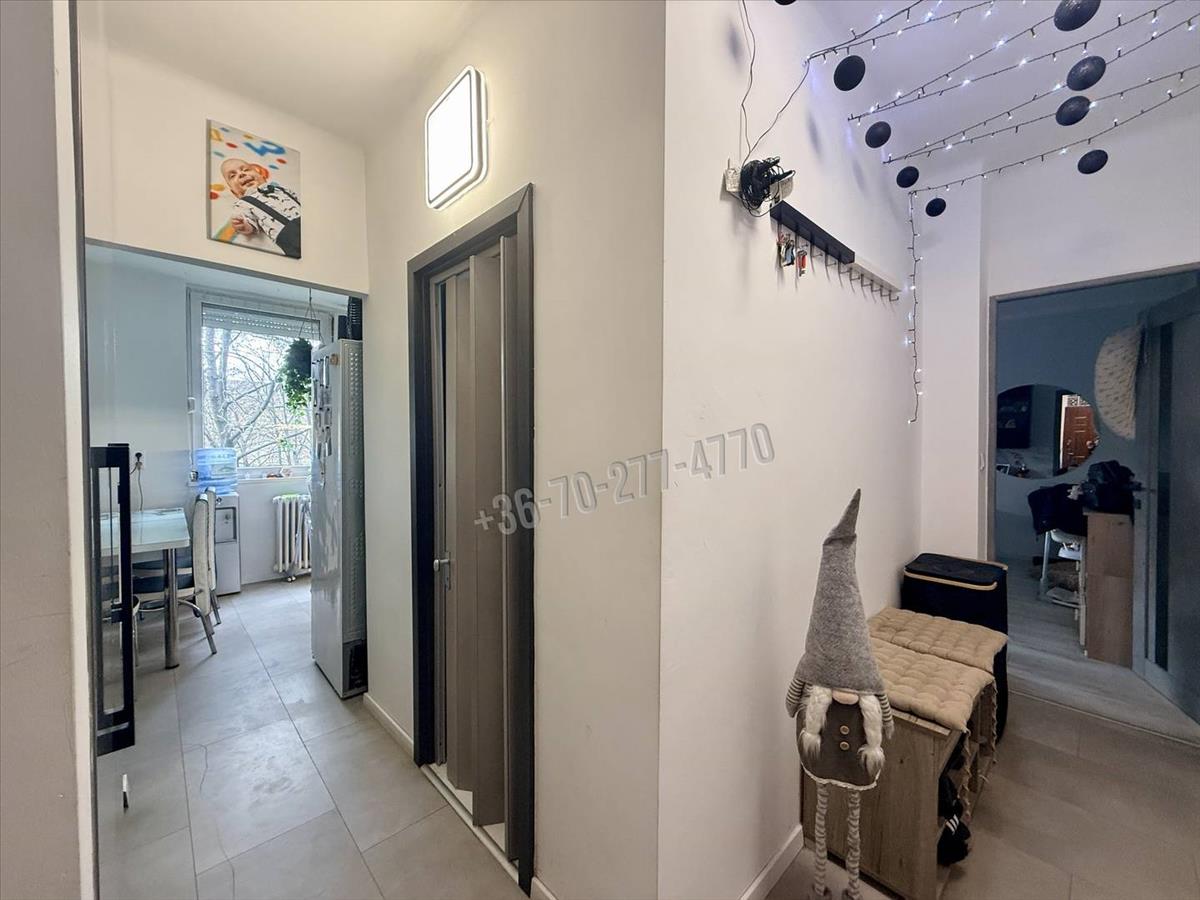 A lakás világos, délnyugati fekvésű és remek elrendezésű: szobái külön nyílnak, tágas nagy konyhával, nagy erkéllyel rendelkezik. Nappali, hálószoba, előszoba, praktikus konyha, kamra, valamint fürdőszoba (káddal és egy helyiségben a WC-vel) biztosítja a mindennapi kényelmet.