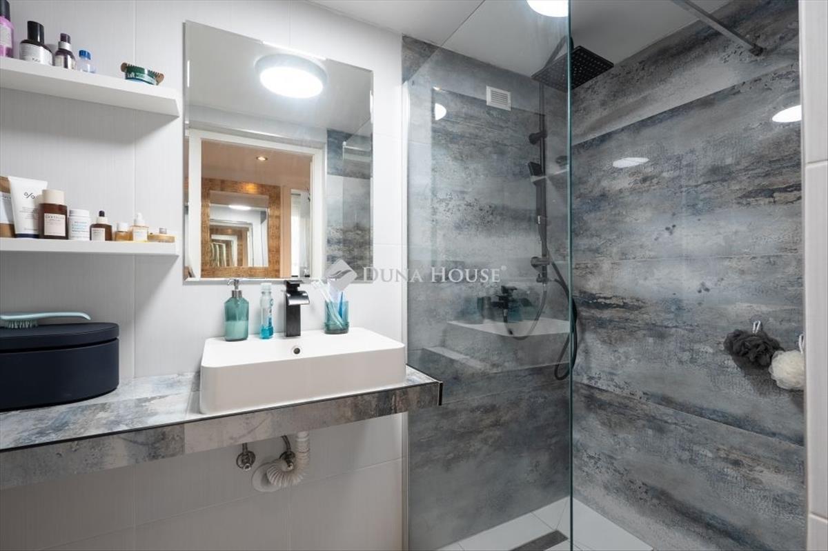 - a fürdőszoba teljesen megújult: modern burkolatokkal, a kád helyett praktikus zuhanyzóval.