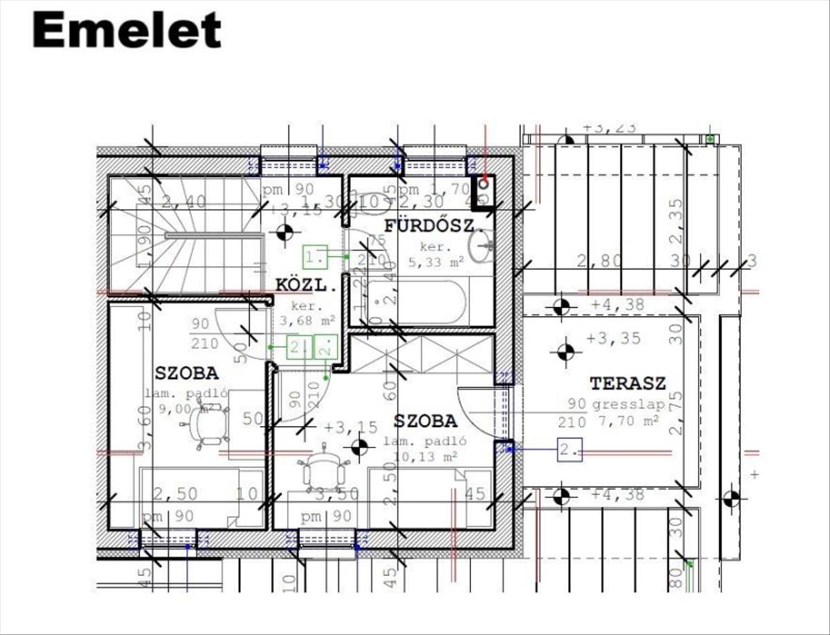 -emelet elosztása: 2 szoba, közlekedő, fürdő + wc, terasz