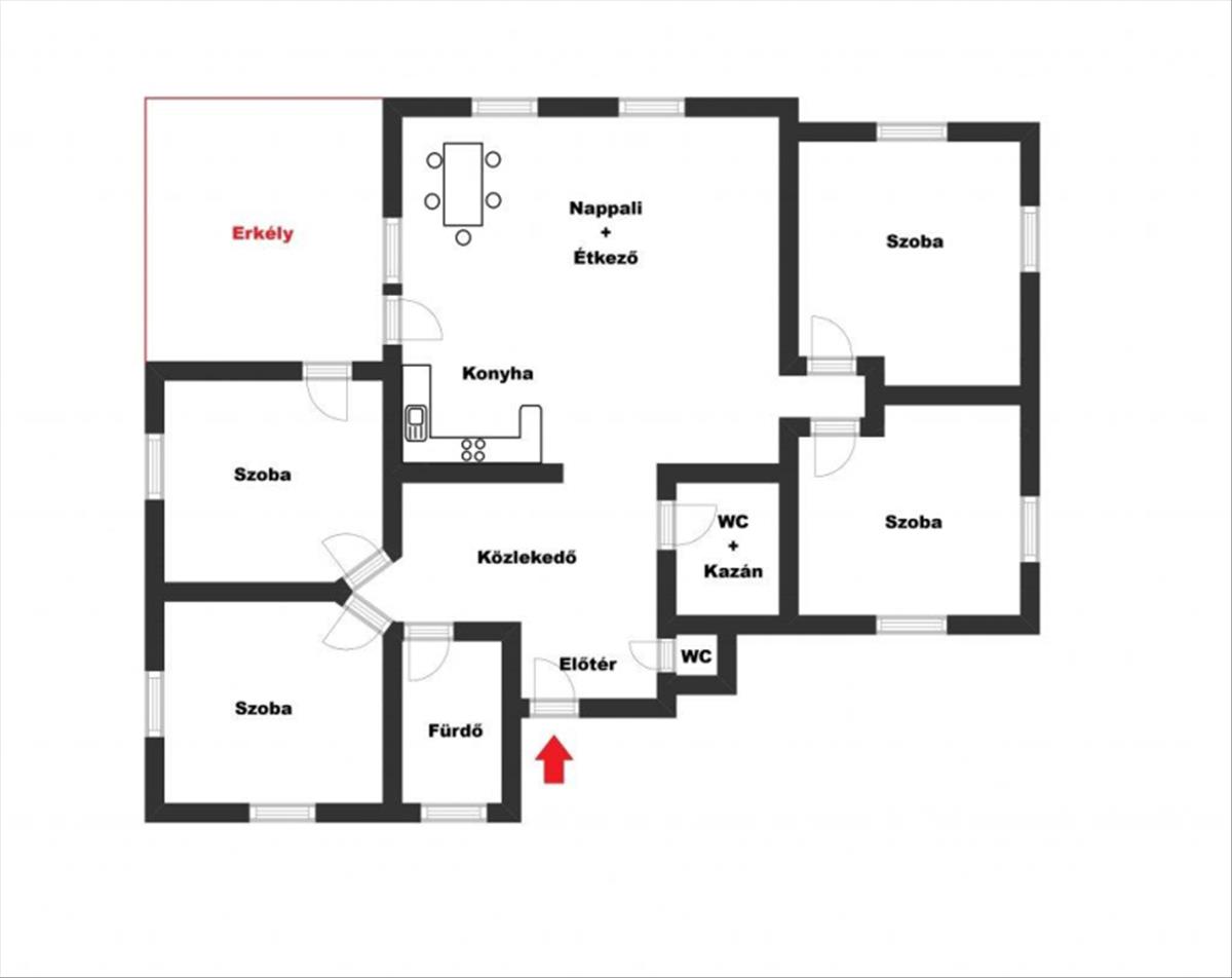 - elrendezése: 4 külön nyíló szoba, konyha – étkező - nappali, fürdő, 2 külön álló wc, előtér, közlekedő, erkély