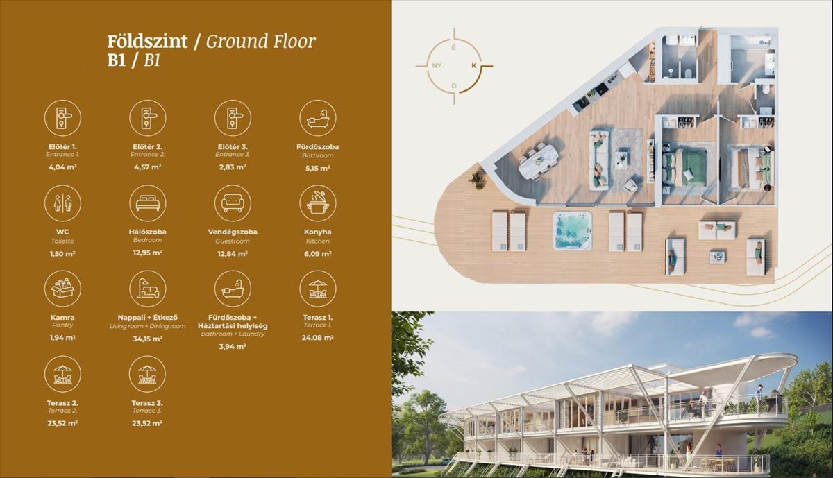 Az 1. emeleti e1 számozású apartman alapterülete 92, 55m², melyhez tartozik egy gyönyörű panorámás 26, 20 m²-es terasz, mely statikailag és gépészetileg is - lehetővé teszi, hogy jakuzzi is beszerelhető legyen.
