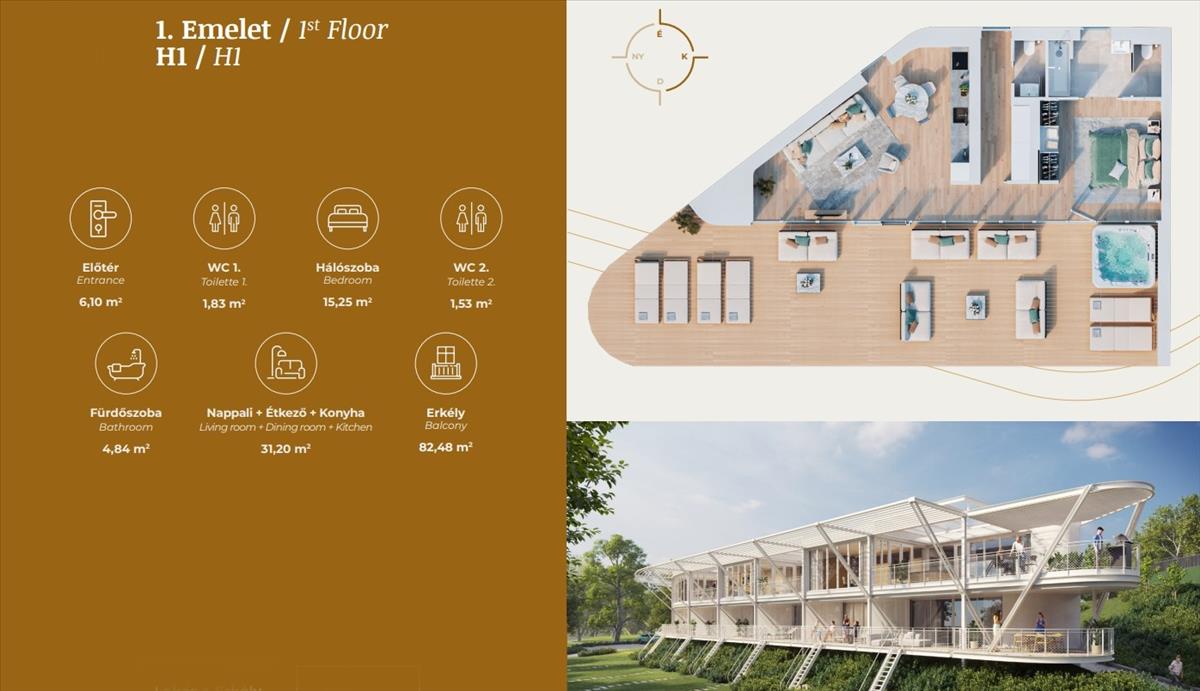 H1 apartman 60, 73m² + 82, 48m² terasz = 146. 500. 000. - Ft