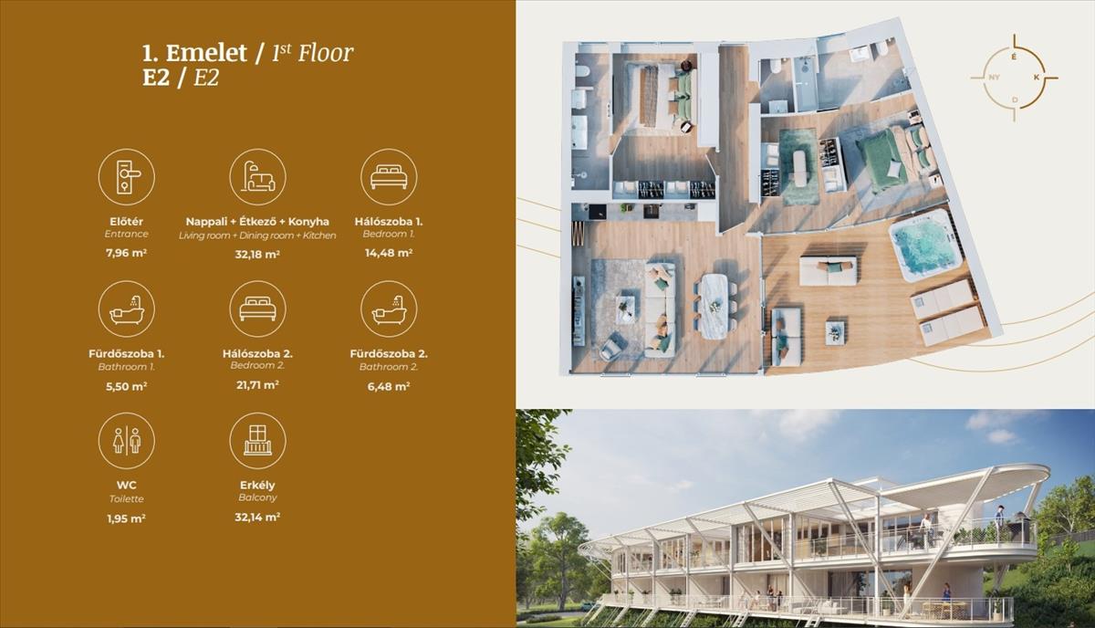 E2 apartman 90, 24m² + 32, 14m² terasz = 185. 900. 000. - Ft