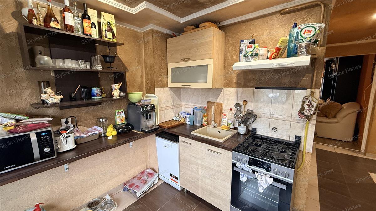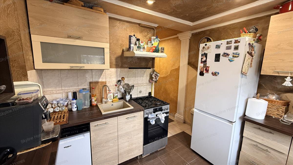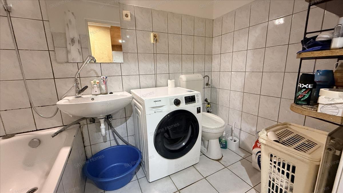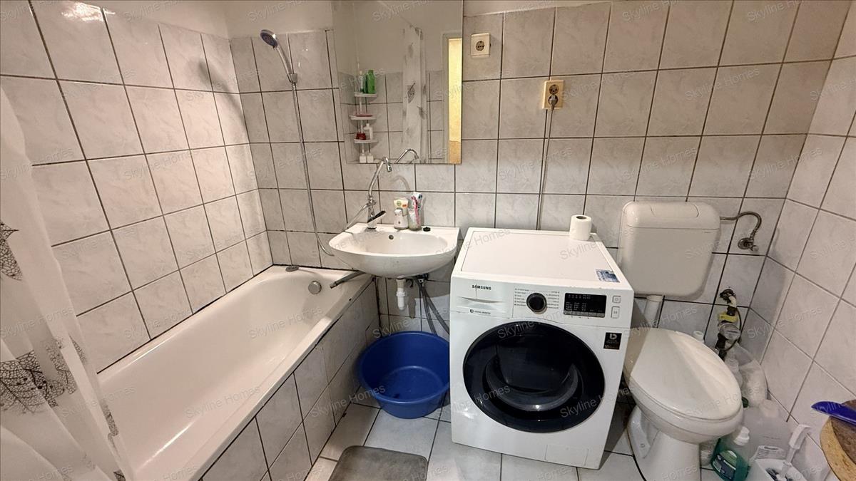 Középen egy kádas fürdőszoba helyezkedik el, míg mellette található a jó állapotú konyha és étkező helysége. Minden helységben a nagy méretű ablakok biztosítják a bejövő fényeket.