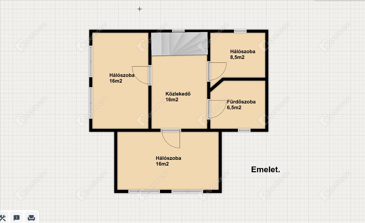 Emelet: társalgó, közlekedő, 3 hálószoba, és egy újabb fürdőszoba.