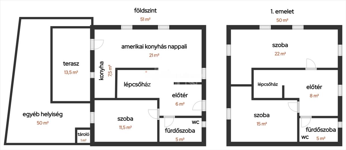 Az emeletre egy kényelmes fokkiosztású stabil lépcsőn juthatunk fel a felső szintre, ahol 8nm -es előtér vagy közösségi tér, kettő egyenként bruttó 22, illetve 15nm nagyságú klimatizált szoba, valamint az 5nm -es kádas fürdőszoba helyezkedik el.