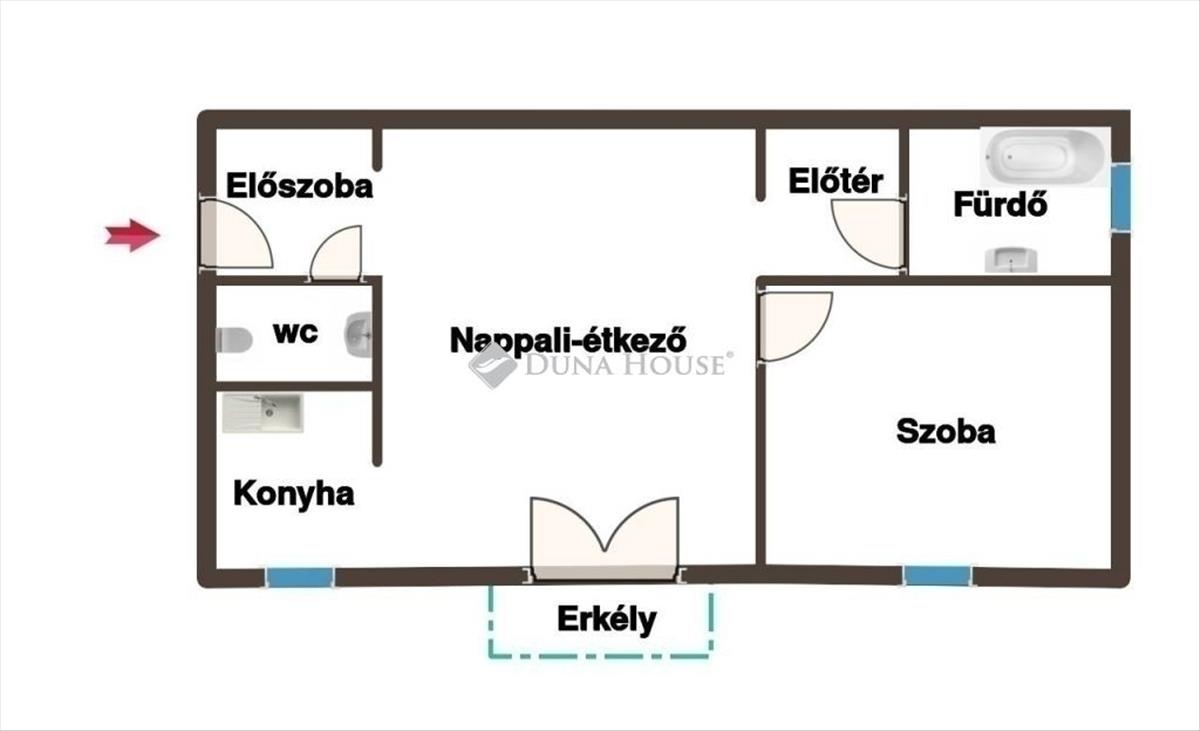 Található a lakásban nappali-étkező (br. 20 / Ne. 18, 4 m2), konyha rész (br. 3, 7 / Ne. 3 m2), szoba (br. 12 / Ne. 7 m2), fürdőszoba (br. 3, 9 / Ne. 2, 63 m2), gardrób (2, 5 m2), előszoba (2, 9 m2), wc (1, 3 m2) és erkély (1, 5 m2).