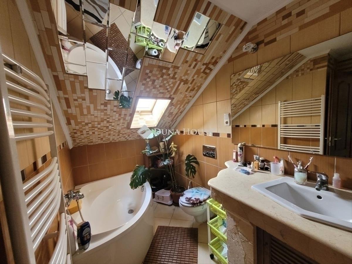A lépcső jobb oldalán tágas, minden igényt kielégítő fürdőszoba emeli a komfortérzetet.