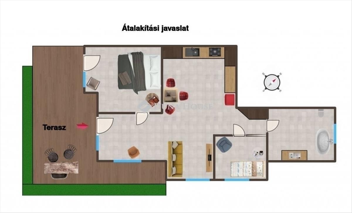 - Földszint + saját terasz + kertkapcsolat ideális otthonosság és praktikusság jellemzi