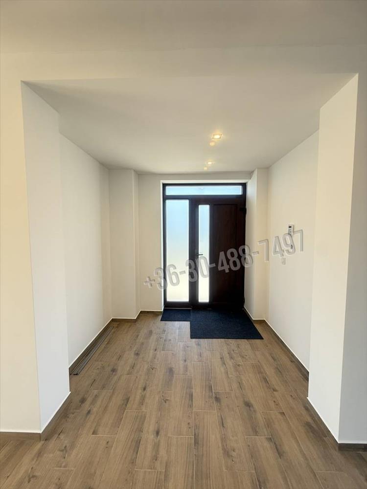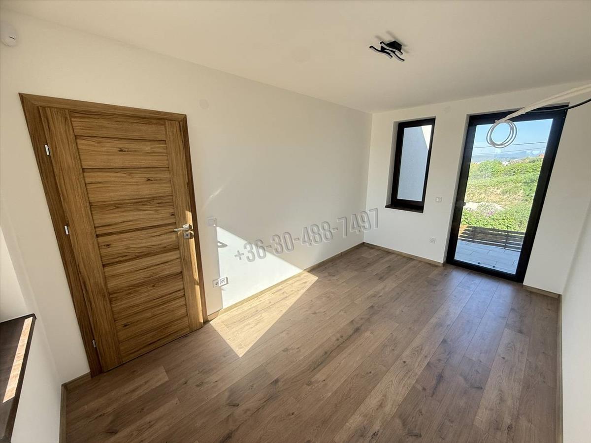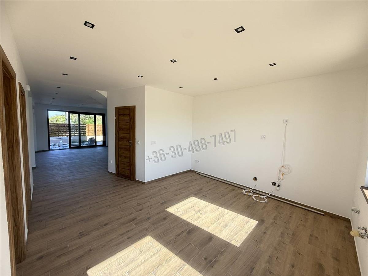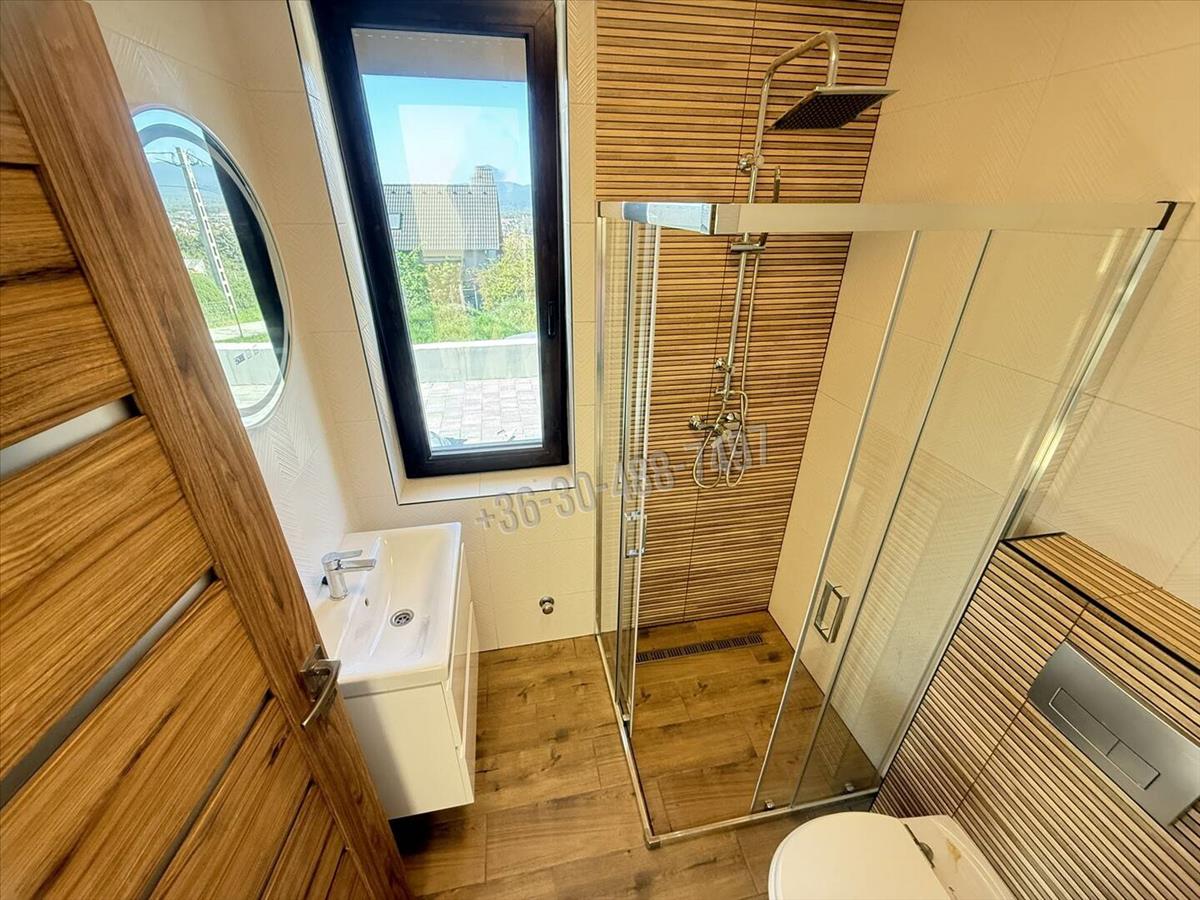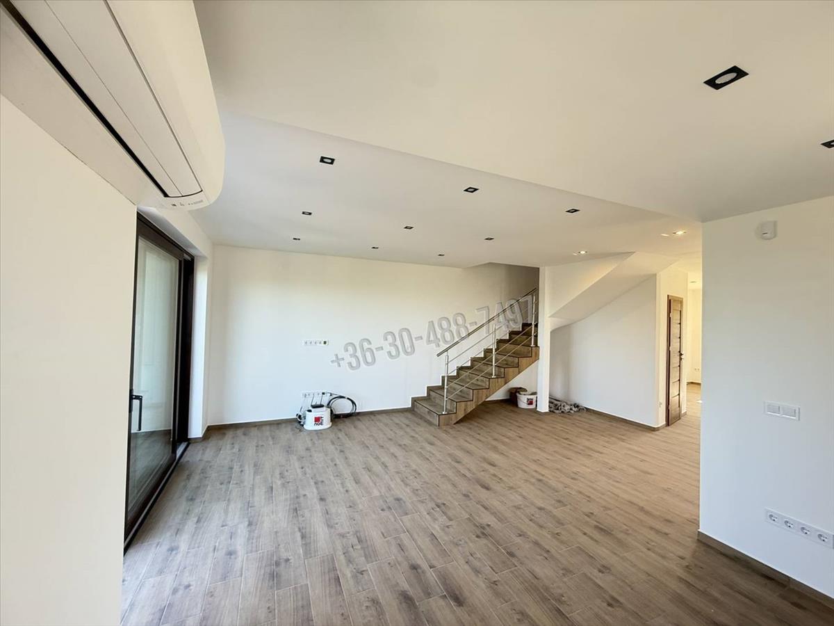 A modern épület belső kétszintes, 4 szobás, két fürdőszoba, minden szobához tartozik terasz, és saját 420 m2 kert is.