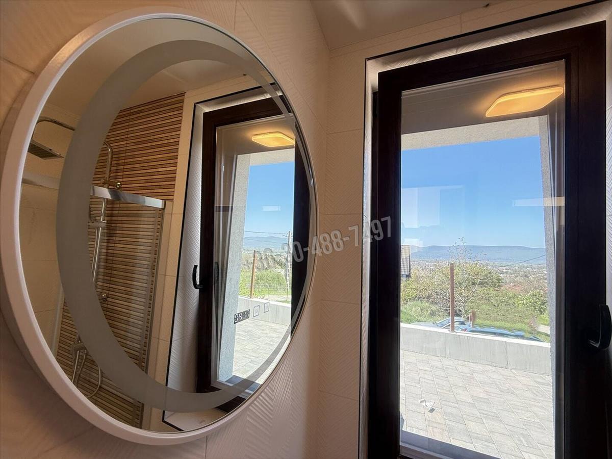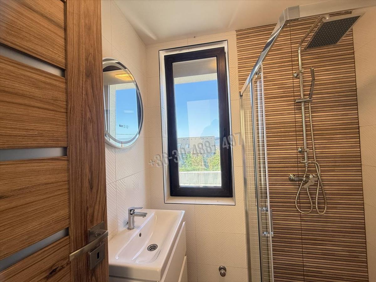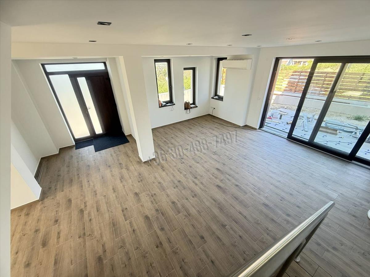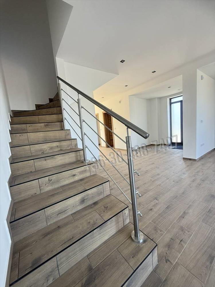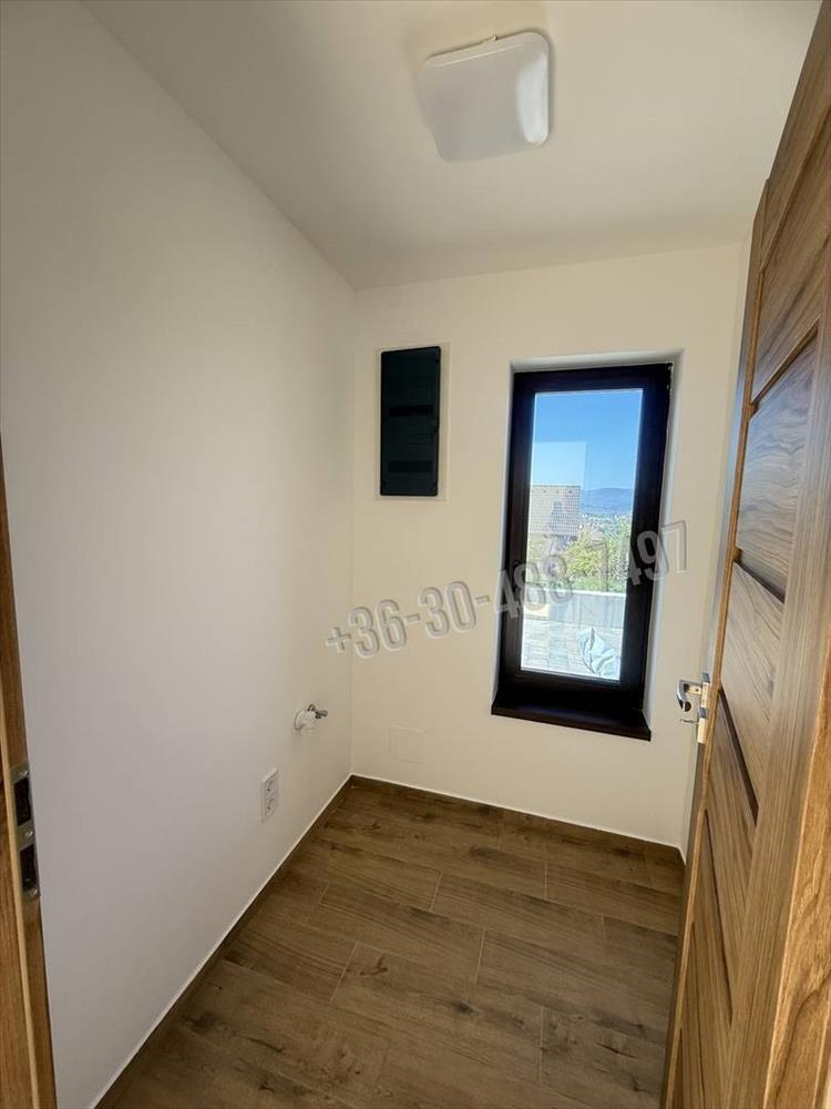 A modern épület belső kétszintes, 4 szobás, két fürdőszoba, minden szobához tartozik terasz, és saját 420 m2 kert is.