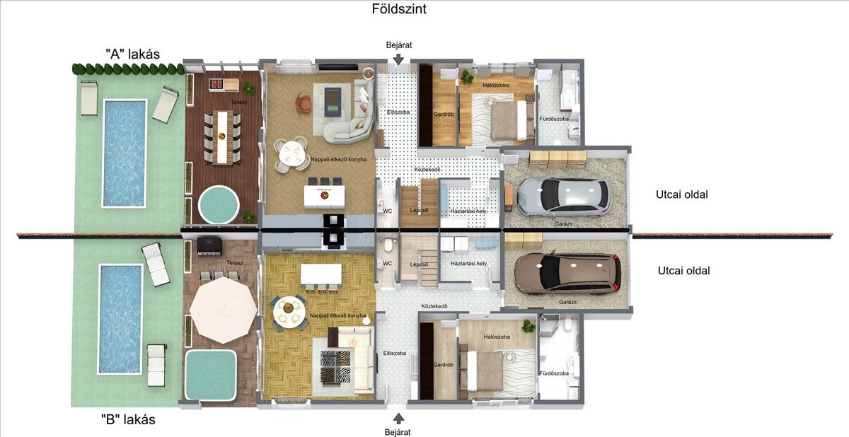 A \"b\" lakás 153, 4 m² hasznos alapterületű, amely tartalmazza a 17, 89 m²-es garázst is. a földszinten tágas, világos nappali–konyha–étkező található kertkapcsolattal és pergolával fedett terasszal, az emeleten pedig hálószobák és két különálló terasz biztosítják a kényelmes, privát lakóteret.