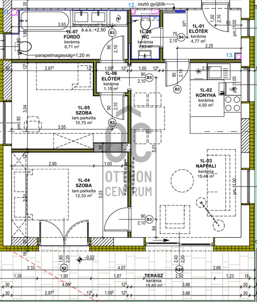 -közbenső födém: 30 cm vasbeton, 7, 5 cm aljzatbeton, 6 cm Austrotherm eps at-l2 lépésálló hangszigetelés, padlófűtés, burkolat