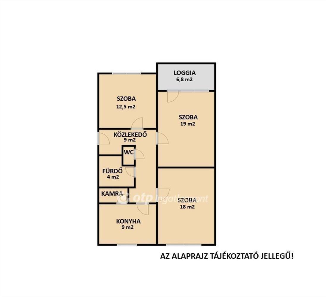 Az ingatlan elosztása rendkívül kedvező: három teljes értékű, külön bejárattal rendelkező hálószoba, fürdőszoba zuhanyzóval, különálló wc, konyha, kamra, közlekedő, valamint egy 6, 8 m2-es - igény esetén beépíthető - loggia található benne.