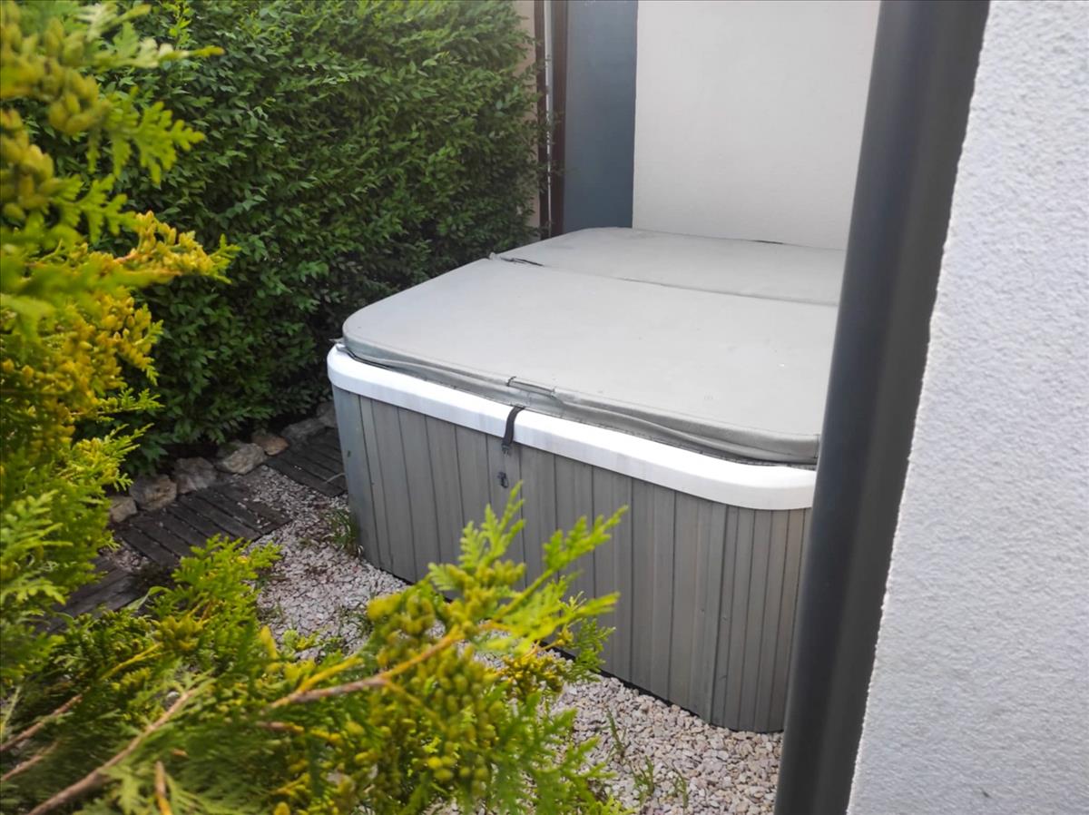 - nappaliból léphetünk a D-i tájolású teraszra, ill. a kertbe, aholegy jakuzzi is található